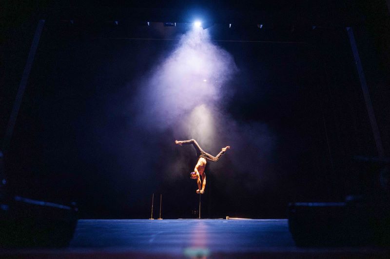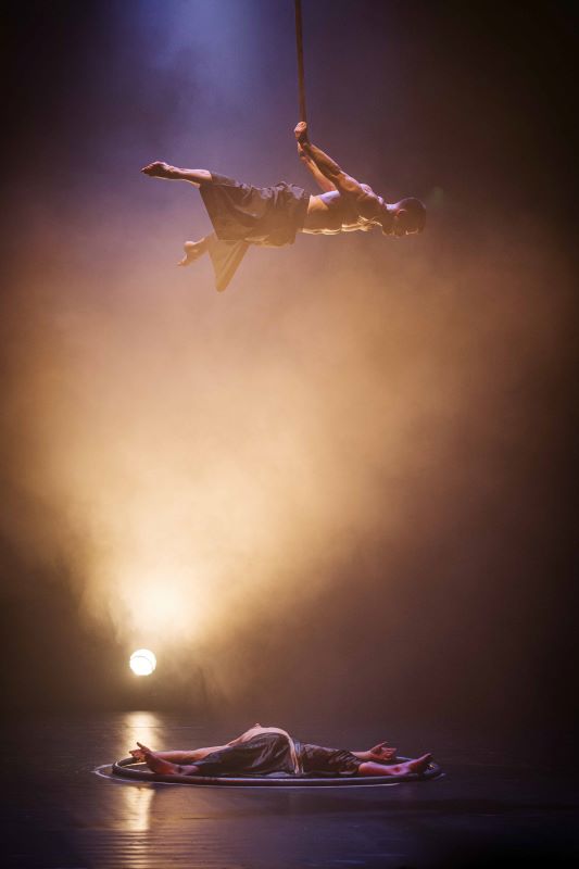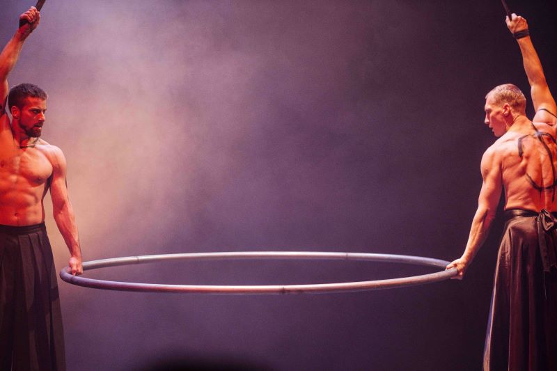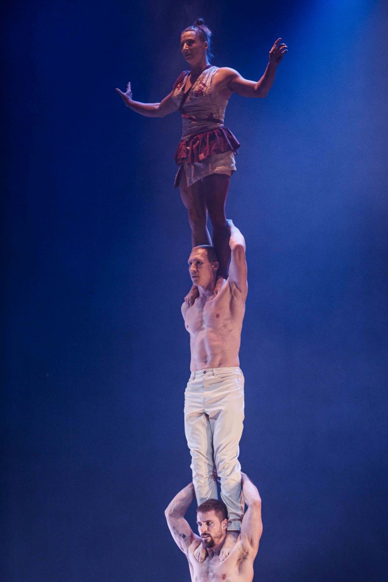 Diváci obdivovali také artistické výkony. Dorazilo trio přátel Martina Illichová, Lukáš Macháček a Jindřich Panský. Martina vybrala do programu jako sólové číslo výstup akrobacie na závěsném kruhu, ve kterém nezapře kořeny gymnastky a sází na své rozsahy a eleganci pohybu. Lukáš a Jindra uvedli svůj duet, který vytvořili už víc jak před rokem pro branický program Miniatury. Tahle byla výrazná a rozhodně stojí za to si ji připomínat. Oba artisté se setkávají na stejné scéně, jeden při zemi v prostoru vymezeném cyr wheelem, jeho alter ego ve vzduchu na strapsech. Dvě kružnice, které se protínají, bratři či sokové. Motiv kruhu je prastarý a víření ve vzduchu odkazuje k dervišským tancům, k rituální podstatě. Jde o silný akrobatický duet plný mužské energie, ve kterém je cítit jasná výstavba a záměr, vedle artistiky i obsah. Rozhodně stojí za opakování a možná by stál i za další rozvedení(?) Celá trojice se pak ještě vrátila s číslem, jež se neslo ve znamení klasické párové a silové akrobacie, Martina nejprve jako loutka, marioneta v rukou obou mužů. V průběhu čísla, v němž všichni tři podávají technicky bezchybný výkon, muži svou loutku uvádějí prostřednictvím kousků šatů do života jako Pygmalion, a to se jim samozřejmě vymstí…