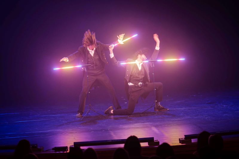 Aby arzenál novocirkusových technik byl úplný, přibyl z Prahy také Jan Jirák, který se specializuje na stojky a obohatil program o sólové číslo s několika stálkami a nechal diváky sledovat pokoření gravitace, za soustředění zenového mistra. Mimka a žonglérka Michaela Stará se představila v tradičním světle, její specialitou je totiž tutting (tanec rukou) a manipulace s pingpongovými míčky, která už k ní patří stejně jako plavé vlasy a křehkost. Sešla se tu skupina přátel a kamarádů, kteří se přišli s diváky podělit o radost z pohybového umění. Co vlastně chtít víc? Na závěr nechybělo světelné číslo Vojty Stolbenka a Lauryho Chanty, které bylo myslím k vidění minulý rok na gala žonglérského dne na Letné a tehdy se mi zdálo pro Mime Fest jako dobrý adept na gala, koncert světelných nástrojů, trochu iluzionistický a trochu žonglérský, který by šlo posunout a využít i divadelně. Z řady převážně efektních čísel se totiž může vyklubat velký potenciál co do využití nové techniky pro klasický jevištní tvar.