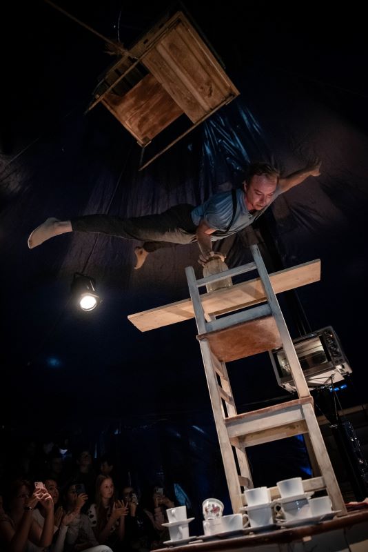 Mates Petrák se vrátil ke kostýmu roztržitého pracovníka pohřební služby, ale tentokrát předvedl klasický klaunský souboj s židlí. V typu nešiky se vyžívá, ale čerpá především ze svého fyzického potenciálu, takže mísí dvě polohy: chlapeckého klauna popletu s akrobatem silákem, jeho výkon je zábavný, ale také obsahuje velmi náročné fyzické prvky. Radím vám většinu z nich bez přípravy nezkoušet, i kdyby to náhodou ta samotná židle vydržela.