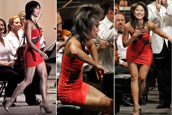 Je mladá , talentovaná a je klavíristkou. Pětadvacetiletá čínská klavírní virtuózka Yuja Wang okouzluje ale nejenom hrou na klavír. Při svém koncertním turné po Severní Americe dokázala upjaté americké publikum šokovat a to doslova. Nebylo to však precizní hrou Rachmaninovova klavírního koncertu. Bylo to tím, co měla na sobě. Pro svůj koncert v Los Angeles, kde v publiku seděl nejeden slavný hollywoodský herec, producent či režisér, zvolila jako garderóbu krátké oranžové šaty s minisukní, třpytivé štrasové punčochy a k tomu zlaté boty na jehlových podpatcích. A co víc, při přednesu Rachmaninovových skladeb prý ještě nezvykle natahovala krk, kroutila hlavou a špulila rty…