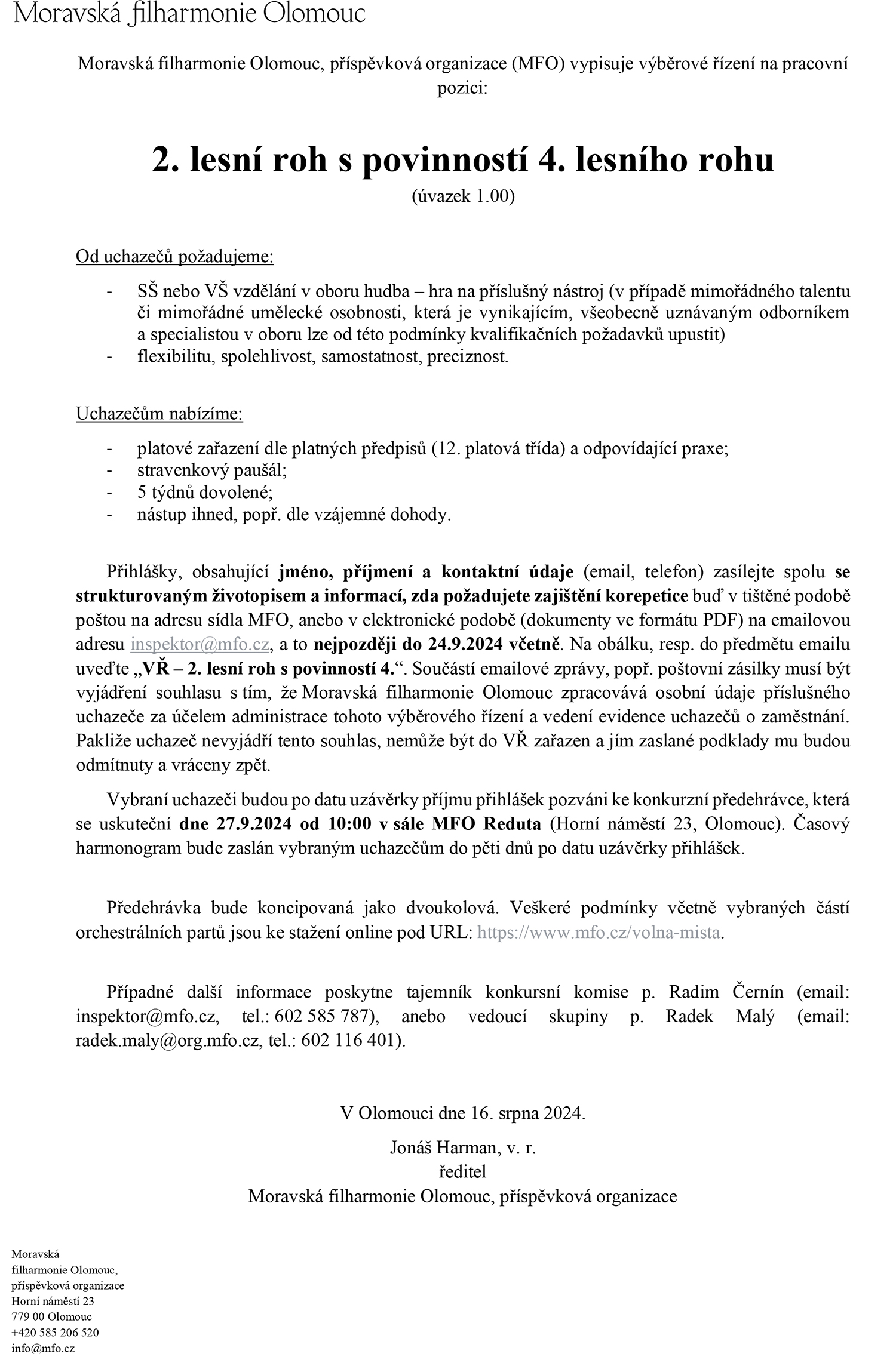 Inzerce Moravská filharmonie Olomouc vypisuje konkurz na 2. lesní roh s povinností 4. lesního rohu Publikováno 05/09/2024 sdílejte: 0 minut čtení sdílejte: TémataSeznam inzerátů Sdílet článek Facebook email zkopíruj odkaz vytisknout sdílejte: Předchozí článek Dramaturg Vítězslav Mikeš: Zajímavá hudba vzniká prakticky všude Další článek Premiéra na míru: Pardubický orchestr zahájí 56. sezonu skladbou vytvořenou právě pro něj 0 0 hlasy Ohodnoťte článek Odebírat Přihlášení Upozornit na nové a další komentáře nové odpovědi na můj komentář Label {} [+] Jméno* E-mail* Webová stránka Label {} [+] Jméno* E-mail* Webová stránka 0 Komentáře Nejstarší Nejnovější Most Voted Inline Feedbacks Zobrazit všechny komentáře Načíst další