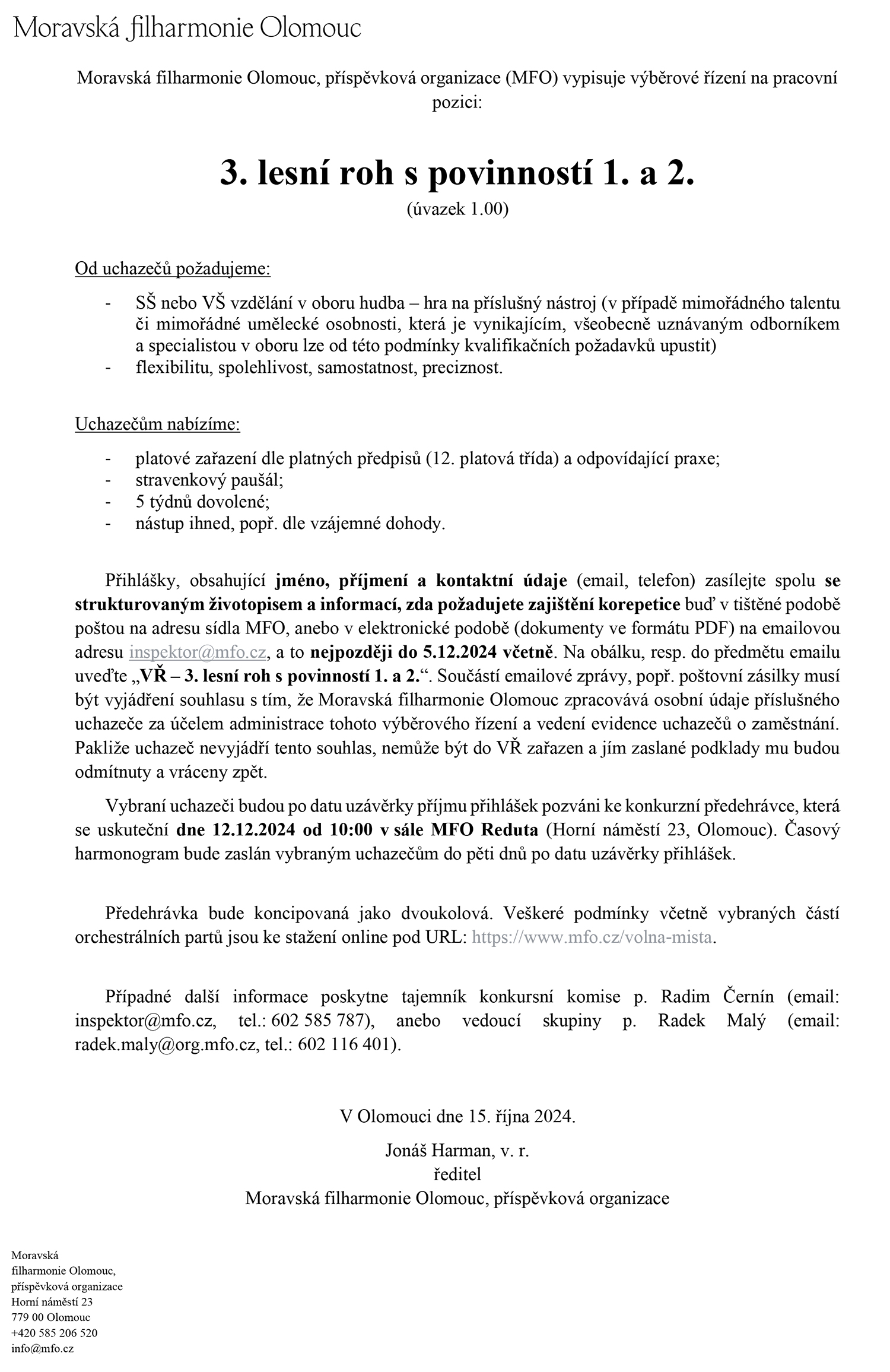 Čtení Moravská filharmonie Olomouc vypisuje konkurz na 3. lesní roh s povinností 1. a 2. lesního rohu