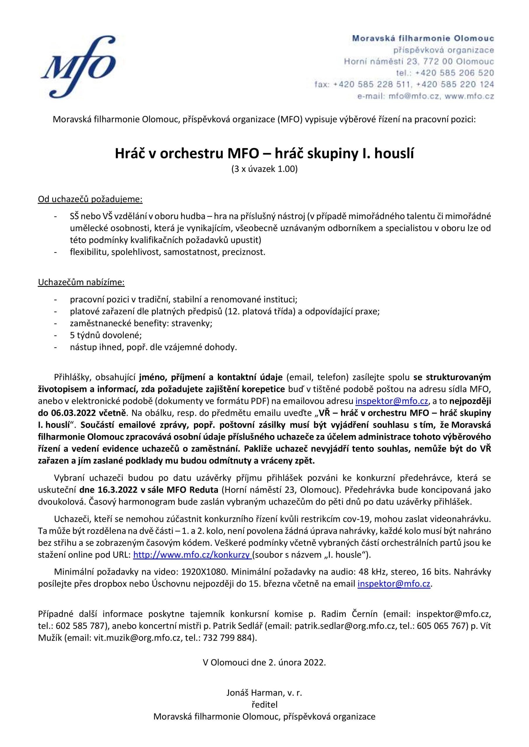 Inzerce Moravská filharmonie Olomouc vypisuje výběrové řízení na hráče skupiny I. houslí Publikováno 20/02/2022 sdílejte: 0 minut čtení sdílejte: TémataSeznam inzerátů Sdílet článek Facebook email zkopíruj odkaz vytisknout sdílejte: Předchozí článek Album týdne Normana Lebrechta: Grażyna Bacewicz – Piano works Další článek Týden s hudbou. Přehled hlavních hudebních událostí v Česku a na Slovensku, TV záznamy 0 0 hlasy Ohodnoťte článek Odebírat Přihlášení Upozornit na nové a další komentáře nové odpovědi na můj komentář Label {} [+] Jméno* E-mail* Webová stránka Label {} [+] Jméno* E-mail* Webová stránka 0 Komentáře Nejstarší Nejnovější Most Voted Inline Feedbacks Zobrazit všechny komentáře Načíst další
