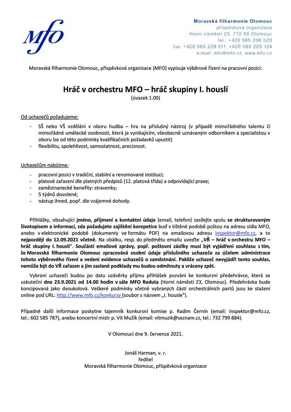 Inzerce Moravská filharmonie Olomouc vypisuje výběrové řízení na pozici: Hráč skupiny I. houslí Publikováno 15/07/2021 sdílejte: 0 minut čtení sdílejte: TémataSeznam inzerátů Sdílet článek Facebook email zkopíruj odkaz vytisknout sdílejte: Předchozí článek Na galavečeru k udílení moravskoslezských Cen Jantar vystoupí Kněžíková a Nohavica Další článek Soutěž o vstupenky: Rusalka v parku (2) 0 0 hlasy Ohodnoťte článek Odebírat Přihlášení Upozornit na nové a další komentáře nové odpovědi na můj komentář Label {} [+] Jméno* E-mail* Webová stránka Label {} [+] Jméno* E-mail* Webová stránka 0 Komentáře Nejstarší Nejnovější Most Voted Inline Feedbacks Zobrazit všechny komentáře Načíst další