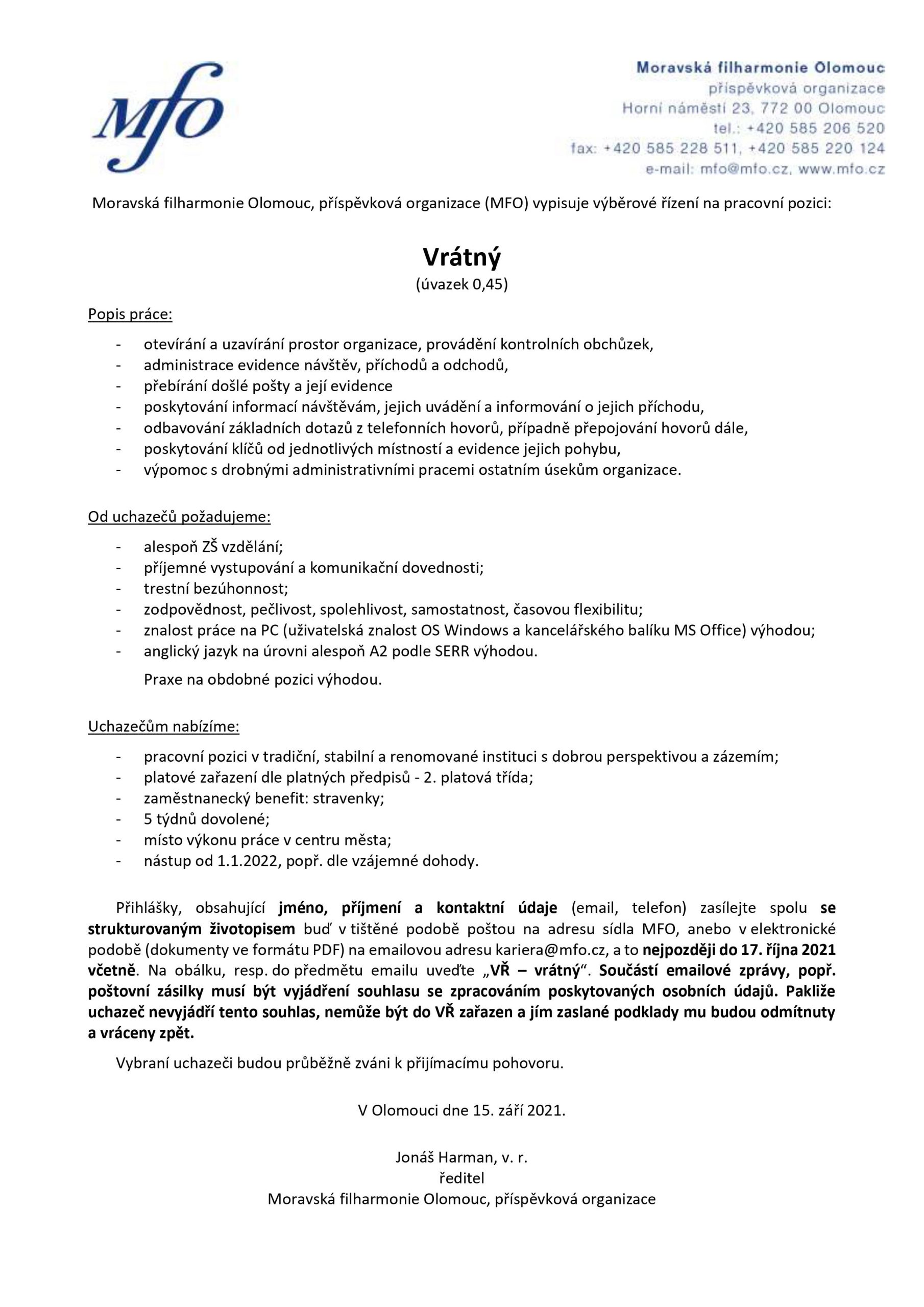 Čtení Moravská filharmonie Olomouc vypisuje výběrové řízení na pozici: vrátný