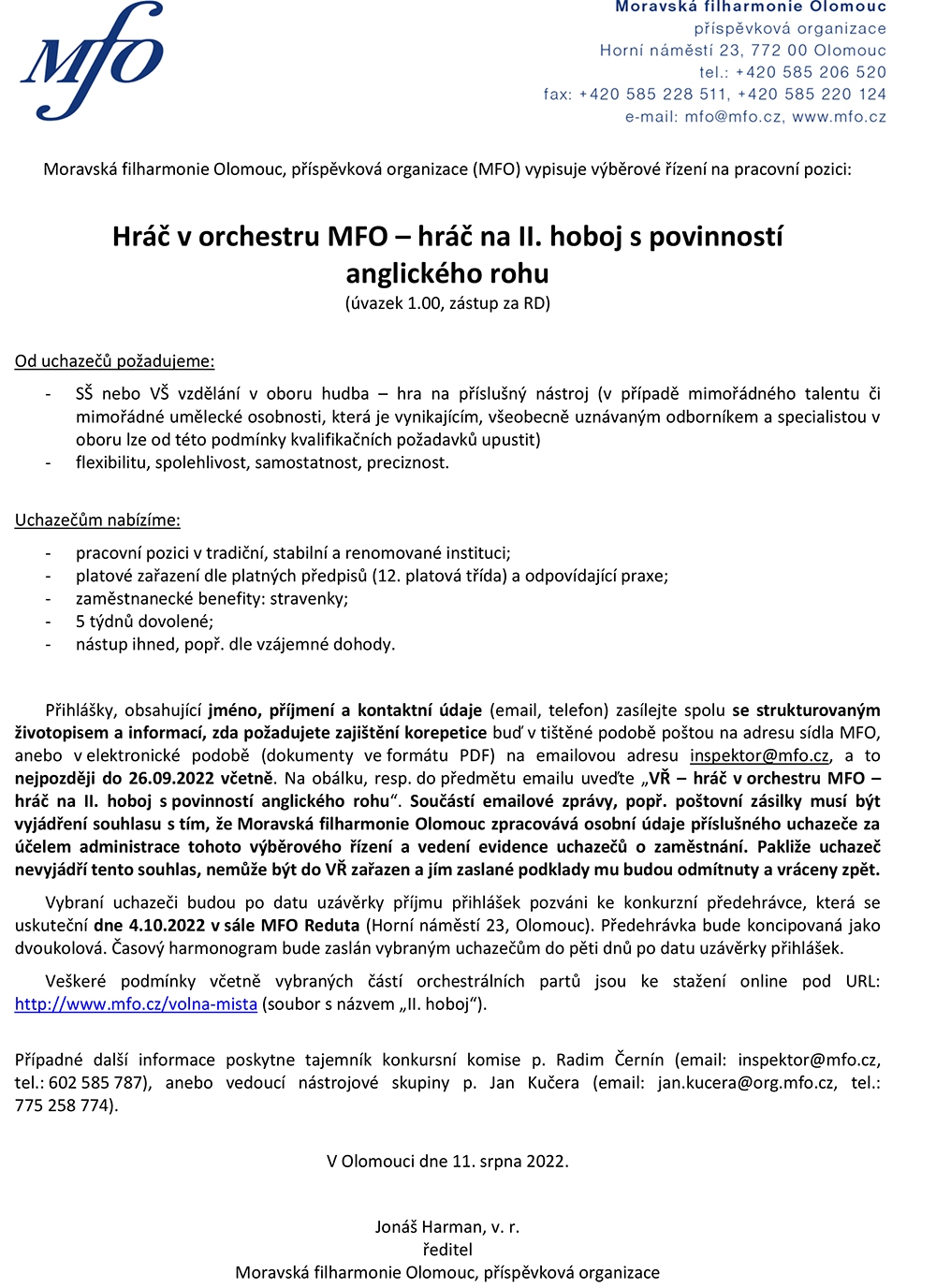 Inzerce Moravská filharmonie Olomouc vypisuje výběrové řízení na pracovní pozici: hráč na II. hoboj s povinností anglického rohu Publikováno 13/08/2022 sdílejte: 0 minut čtení sdílejte: TémataSeznam inzerátů Sdílet článek Facebook email zkopíruj odkaz vytisknout sdílejte: Předchozí článek Letošní ročník Hudební akademie Terezín je věnovaný „nežádoucí“ hudbě Další článek Svatováclavský hudební festival zahájí Mozartova Velká mše 0 0 hlasy Ohodnoťte článek Odebírat Přihlášení Upozornit na nové a další komentáře nové odpovědi na můj komentář Label {} [+] Jméno* E-mail* Webová stránka Label {} [+] Jméno* E-mail* Webová stránka 0 Komentáře Nejstarší Nejnovější Most Voted Inline Feedbacks Zobrazit všechny komentáře Načíst další