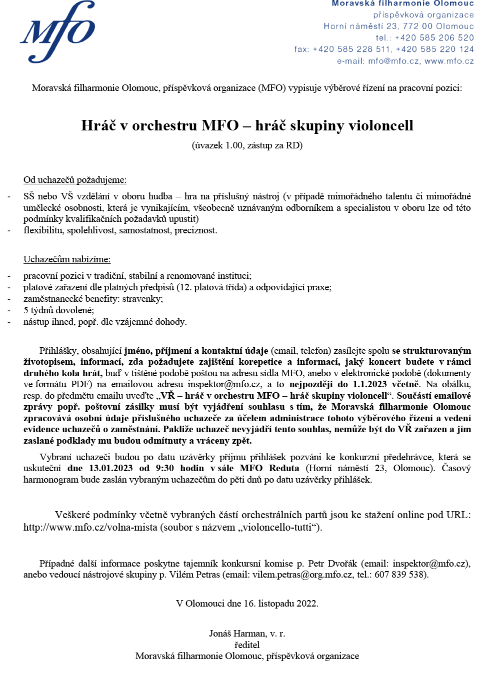 Inzerce Moravská filharmonie Olomouc vypisuje výběrové řízení na pracovní pozici: Hráč skupiny violoncell Publikováno 20/11/2022 sdílejte: 0 minut čtení sdílejte: TémataSeznam inzerátů Sdílet článek Facebook email zkopíruj odkaz vytisknout sdílejte: Předchozí článek Album týdne Normana Lebrechta: Klavírní transkripce dvou excentrických skladatelů Další článek Sledujte záznam opery Siegfried z Berlínské státní opery 0 0 hlasy Ohodnoťte článek Odebírat Přihlášení Upozornit na nové a další komentáře nové odpovědi na můj komentář Label {} [+] Jméno* E-mail* Webová stránka Label {} [+] Jméno* E-mail* Webová stránka 0 Komentáře Nejstarší Nejnovější Most Voted Inline Feedbacks Zobrazit všechny komentáře Načíst další