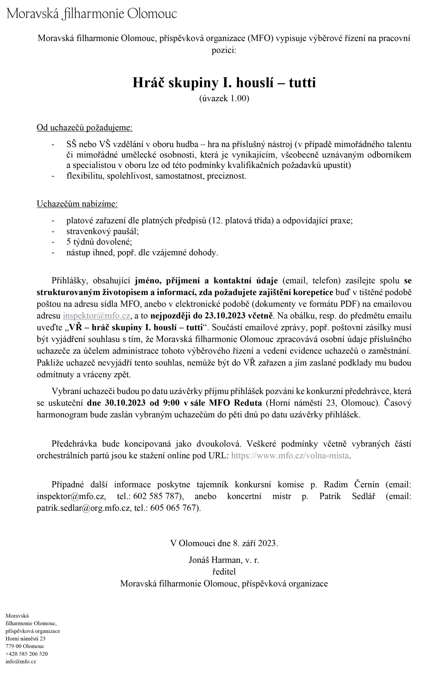 Čtení Moravská filharmonie vypisuje konkurz na hráče skupiny I. houslí – tutti