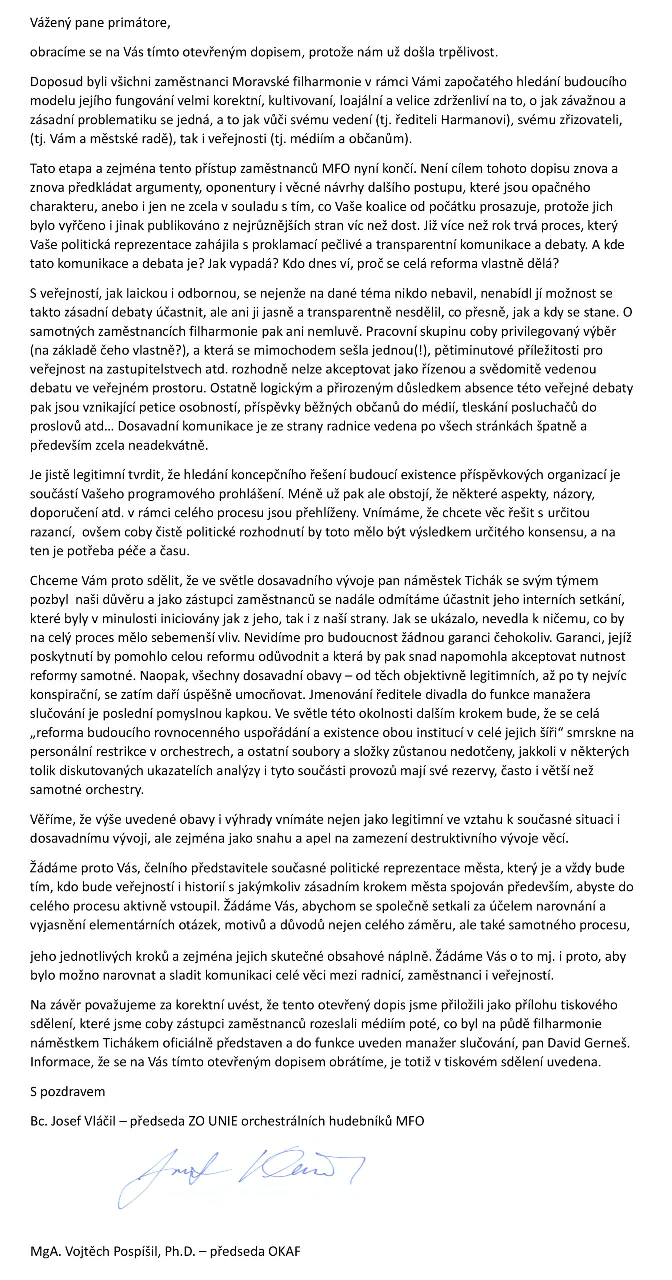 - Abonentní koncert filharmonie oděné v protestních tričkách „My jsme MFO“, kterými zaměstnanci vyjadřují zásadní nesouhlas se způsobem řešení financování a budoucího fungování MFO.