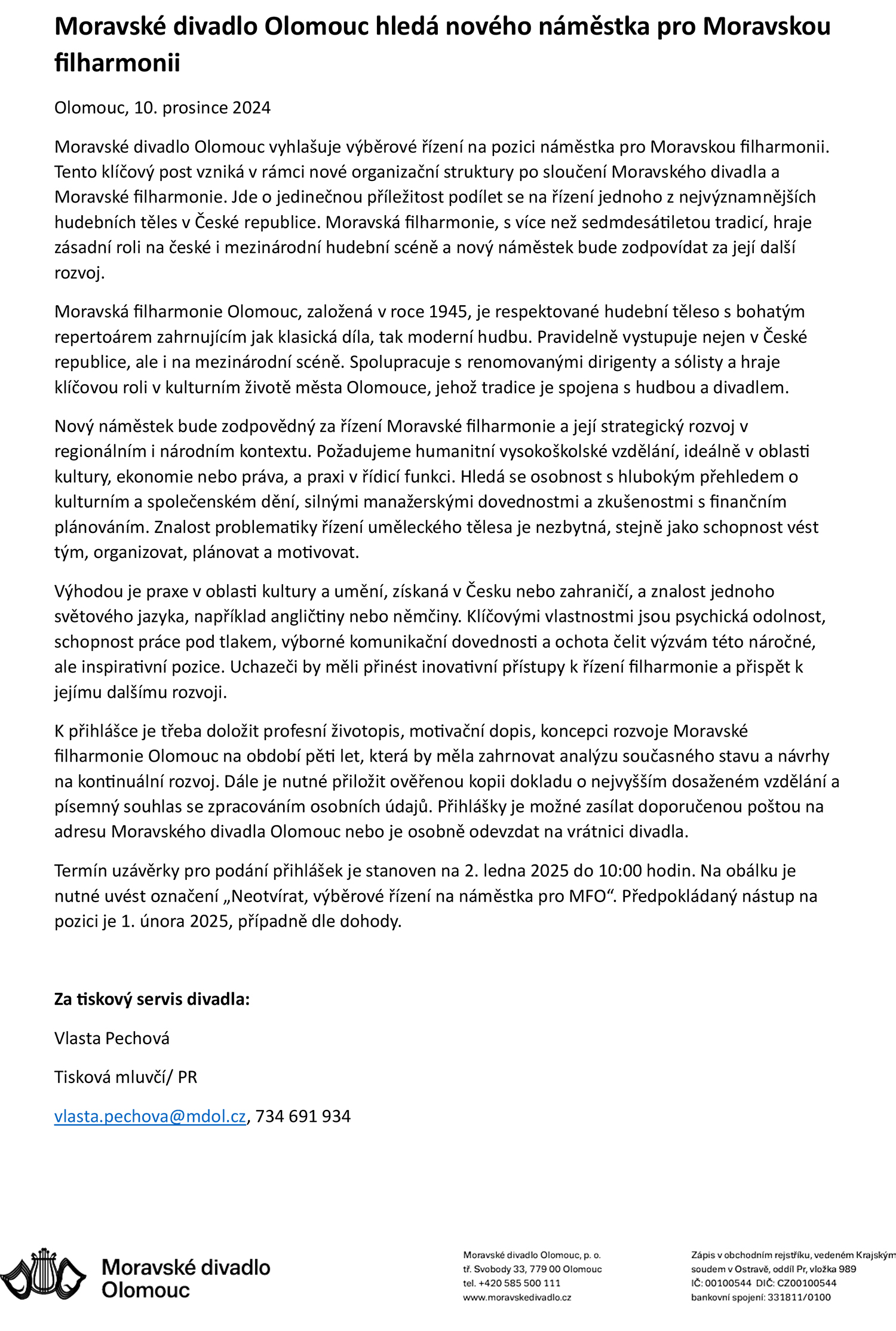 Inzerce Moravské divadlo Olomouc hledá nového náměstka pro Moravskou filharmonii Publikováno 10/12/2024 sdílejte: 0 minut čtení sdílejte: TémataSeznam inzerátů Sdílet článek Facebook email zkopíruj odkaz vytisknout sdílejte: Předchozí článek Týden klidu v historickém klášteře? Broumov vyhlašuje open call Další článek Kdo získá Master Prix? Nadace Život umělce zveřejnila jména letošních laureátů 0 0 hlasy Ohodnoťte článek Odebírat Přihlášení Upozornit na nové a další komentáře nové odpovědi na můj komentář Label {} [+] Jméno* E-mail* Webová stránka Label {} [+] Jméno* E-mail* Webová stránka 0 Komentáře Nejstarší Nejnovější Most Voted Inline Feedbacks Zobrazit všechny komentáře Načíst další