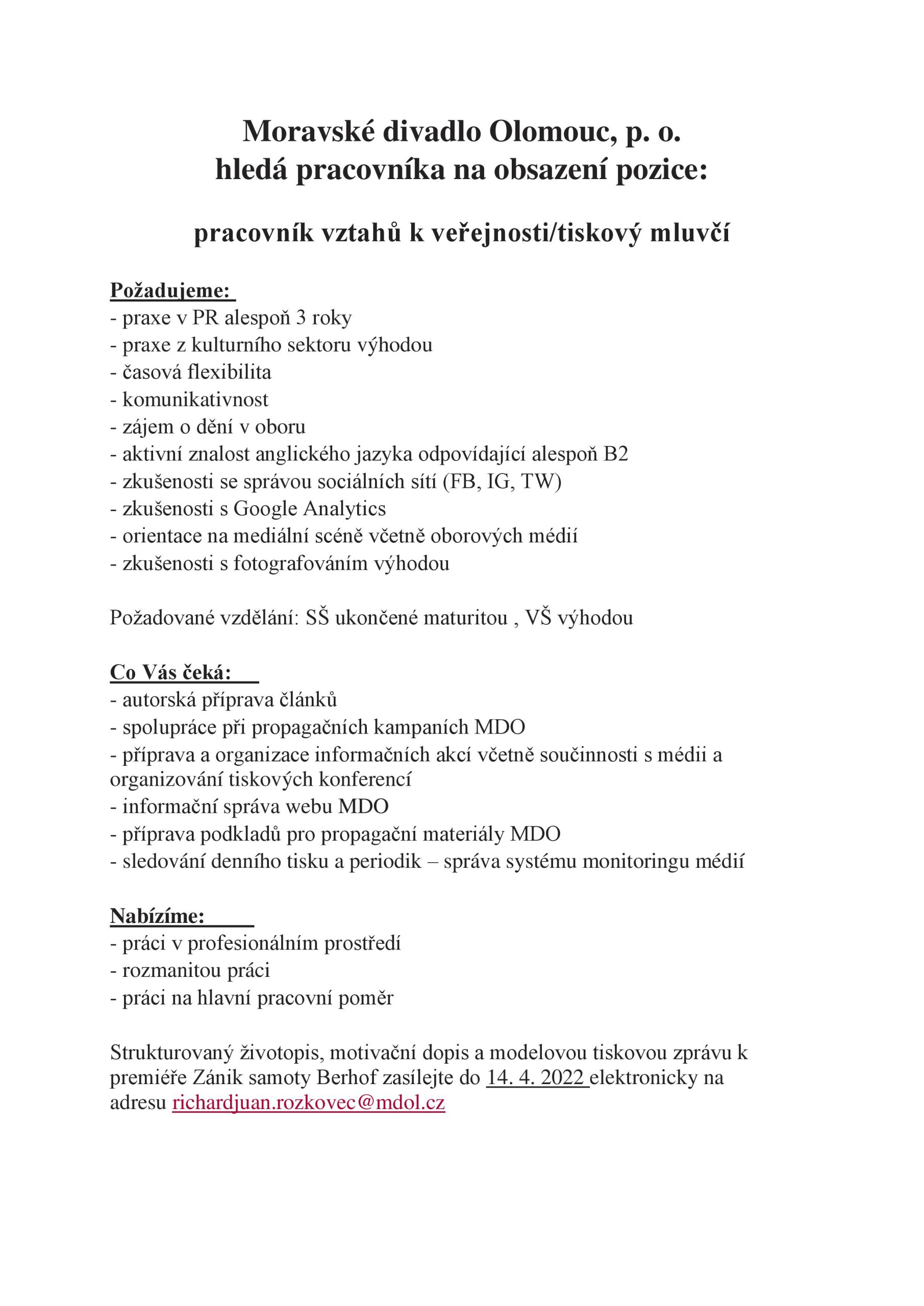 Inzerce Moravské divadlo Olomouc hledá pracovníka vztahů k veřejnosti a tiskového mluvčího Publikováno 09/04/2022 sdílejte: 0 minut čtení sdílejte: TémataSeznam inzerátů Sdílet článek Facebook email zkopíruj odkaz vytisknout sdílejte: Předchozí článek Slovenský filharmonický sbor vystoupí na Velikonočním festivalu v Baden-Badenu Další článek Album týdne Normana Lebrechta: Rachmaninov – Klavírní sonáta č. 1 a Moments musicaux 0 0 hlasy Ohodnoťte článek Odebírat Přihlášení Upozornit na nové a další komentáře nové odpovědi na můj komentář Label {} [+] Jméno* E-mail* Webová stránka Label {} [+] Jméno* E-mail* Webová stránka 0 Komentáře Nejstarší Nejnovější Most Voted Inline Feedbacks Zobrazit všechny komentáře Načíst další