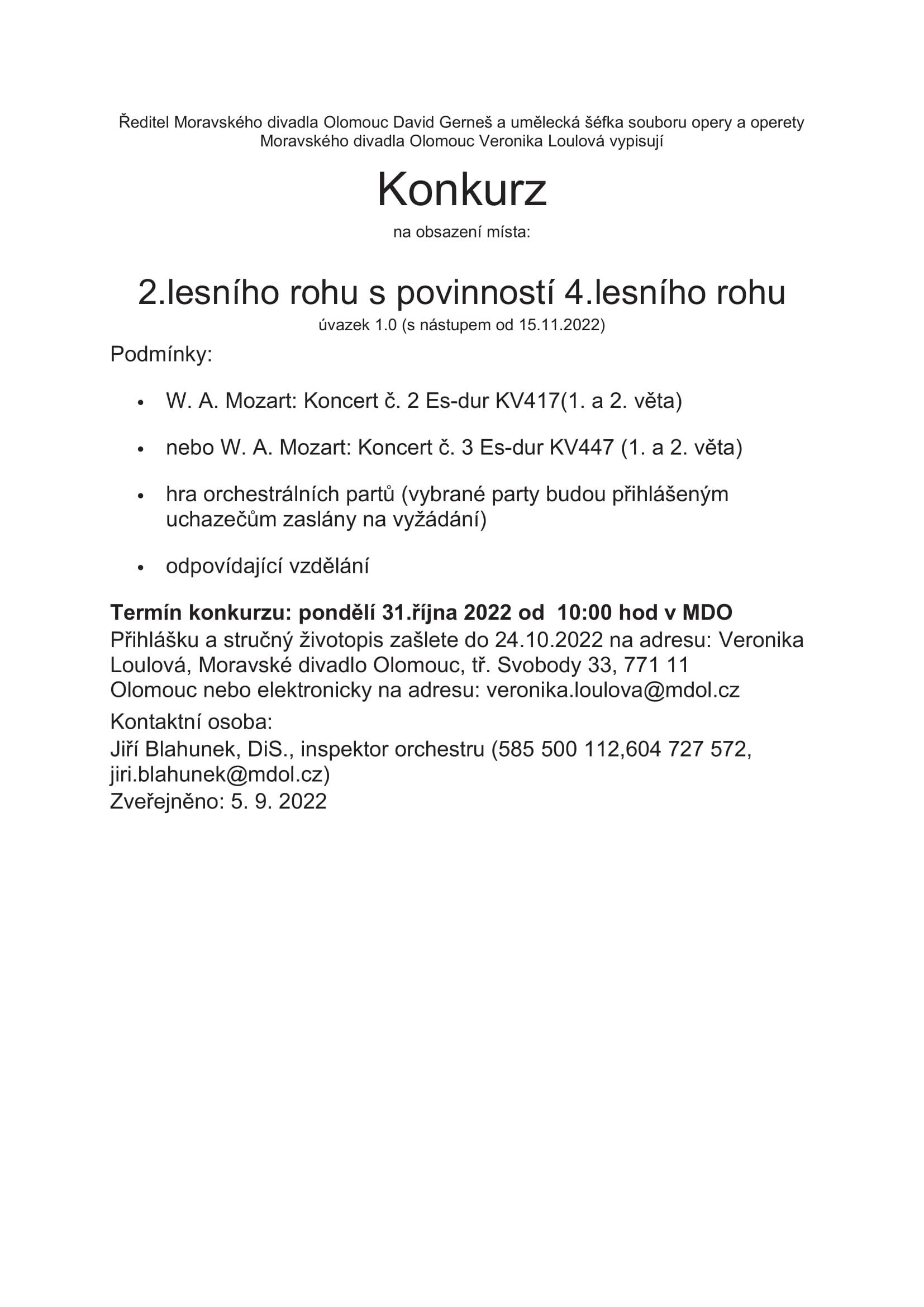 Inzerce Moravské divadlo Olomouc vypisuje konkurz na obsazení místa 2. lesního rohu s povinností 4. lesního rohu Publikováno 16/09/2022 sdílejte: 0 minut čtení sdílejte: TémataSeznam inzerátů Sdílet článek Facebook email zkopíruj odkaz vytisknout sdílejte: Předchozí článek Operní panorama Heleny Havlíkové (381) – Inaugurační Věc Makropulos jen/aspoň koncertně Další článek Rozhovor Plus: Elīna Garanča a Jan Bubák ve Vídeňské státní opeře 0 0 hlasy Ohodnoťte článek Odebírat Přihlášení Upozornit na nové a další komentáře nové odpovědi na můj komentář Label {} [+] Jméno* E-mail* Webová stránka Label {} [+] Jméno* E-mail* Webová stránka 0 Komentáře Nejstarší Nejnovější Most Voted Inline Feedbacks Zobrazit všechny komentáře Načíst další