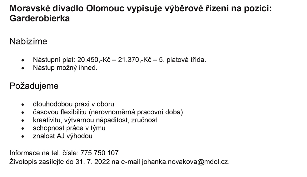 Inzerce Moravské divadlo vypisuje výběrové řízení na pozici: Garderobierka Publikováno 02/07/2022 sdílejte: 0 minut čtení sdílejte: TémataSeznam inzerátů Sdílet článek Facebook email zkopíruj odkaz vytisknout sdílejte: Předchozí článek Slovenská filharmonie se přesune z koncertního sálu na náměstí Další článek Festival Tanec Praha 2022 – kulturní krizi navzdory 0 0 hlasy Ohodnoťte článek Odebírat Přihlášení Upozornit na nové a další komentáře nové odpovědi na můj komentář Label {} [+] Jméno* E-mail* Webová stránka Label {} [+] Jméno* E-mail* Webová stránka 0 Komentáře Nejstarší Nejnovější Most Voted Inline Feedbacks Zobrazit všechny komentáře Načíst další