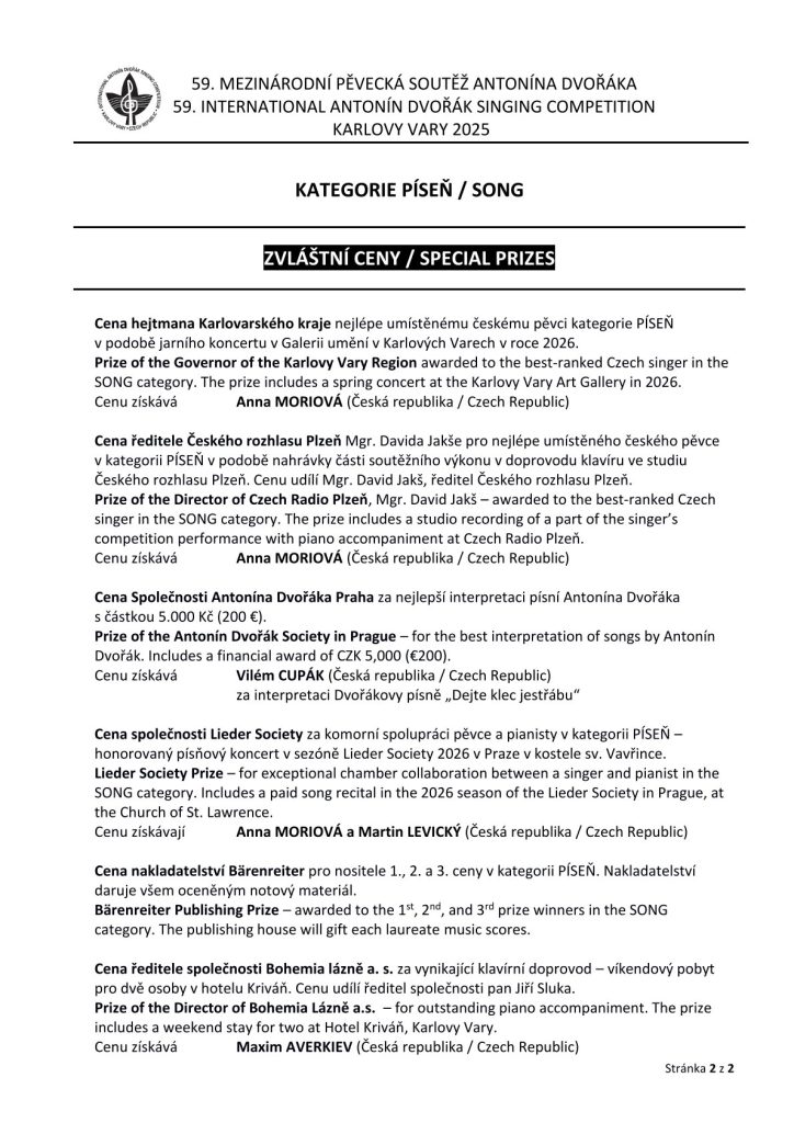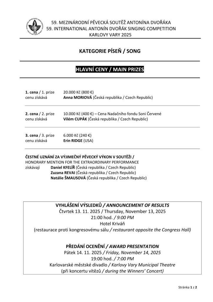 Toto jsou vítězové Mezinárodní pěvecké soutěže Antonína Dvořáka 2025 v kategorii Píseň: