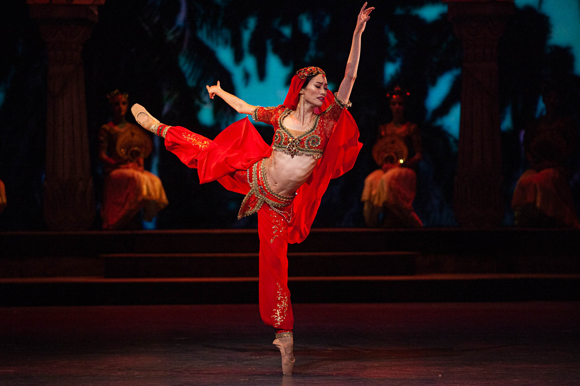 Fumi Kaneko se v titulní roli zaskvěla jako éterický víla se samozřejmou technikou a přirozeným herectvím. Využívá své skvělé dispozice a útlý vzhled, vytváří iluzi až nehmotného stvoření a její aplomb je potěšením. Není to však bezduchá krása, její postava byla prodchnutá i lidskostí, navíc ve skvělé souhře s Yasmine Naghdi, která se svou soupeřkou vede dialog bez patosu a opravdově. Nikiinu plachost i hravost v setkání se Solorem vystřídá zděšení z poznání jeho věrolomnosti, zkrat i zoufalství.