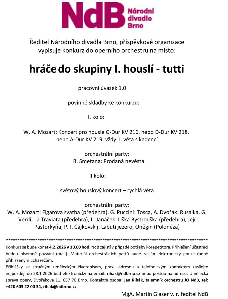 Inzerce Národní divadlo Brno přijme hráče do skupiny 1. houslí – tutti Publikováno 08/12/2025 sdílejte: 0 minut čtení sdílejte: TémataSeznam inzerátů Sdílet článek Facebook email zkopíruj odkaz vytisknout sdílejte: Předchozí článek Hudební salón Café Crème uvádí poslední koncert roku s jazzovou afterparty Další článek The Trio zakončí hudební sezónu v Třeboni, program 23. ročníku MHF Třeboňská nocturna odhalen 0 0 hlasy Ohodnoťte článek Odebírat Přihlášení Upozornit na nové a další komentáře nové odpovědi na můj komentář Label {} [+] Jméno* E-mail* Webová stránka Label {} [+] Jméno* E-mail* Webová stránka 0 Komentáře Nejstarší Nejnovější Most Voted Inline Feedbacks Zobrazit všechny komentáře Načíst další
