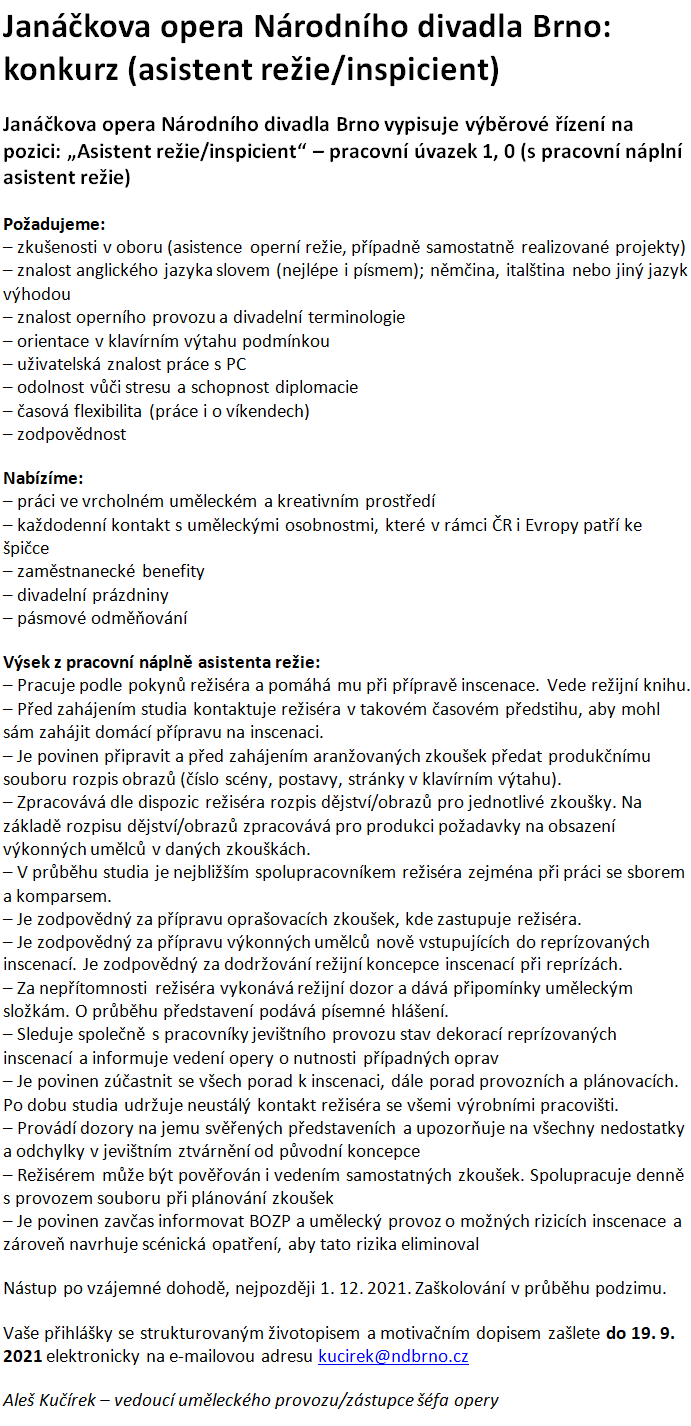 Inzerce Národní divadlo Brno vyhlašuje konkurz na pozici asistenta režie/inspicienta Janáčkovy opery Publikováno 10/09/2021 sdílejte: 0 minut čtení sdílejte: TémataSeznam inzerátů Sdílet článek Facebook email zkopíruj odkaz vytisknout sdílejte: Předchozí článek Spící krasavice, premiéra pohádkového baletu Marcie Haydée v Národním divadle Další článek Festival Lípa Musica sobotním zahajovacím koncertem vzdá poctu Dvořákovi 0 0 hlasy Ohodnoťte článek Odebírat Přihlášení Upozornit na nové a další komentáře nové odpovědi na můj komentář Label {} [+] Jméno* E-mail* Webová stránka Label {} [+] Jméno* E-mail* Webová stránka 0 Komentáře Nejstarší Nejnovější Most Voted Inline Feedbacks Zobrazit všechny komentáře Načíst další