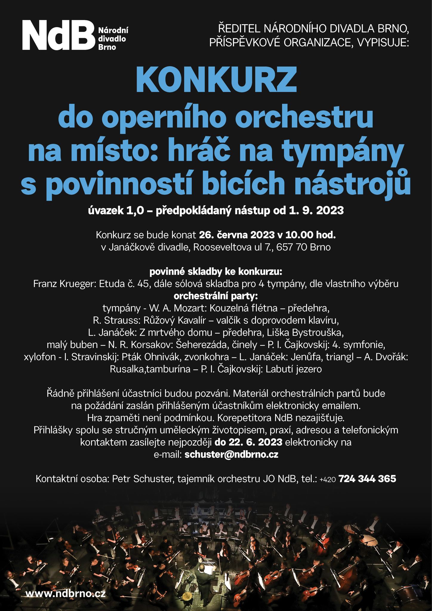 Inzerce Národní divadlo Brno vypisuje konkurz do operního orchestru: hráč na tympány s povinností bicích nástrojů Publikováno 19/06/2023 sdílejte: 0 minut čtení sdílejte: TémataSeznam inzerátů Sdílet článek Facebook email zkopíruj odkaz vytisknout sdílejte: Předchozí článek Moravské divadlo Olomouc vypisuje výběrové řízení na Technického náměstka ředitele Další článek Jan Žemla: Chtěl jsem, aby se Janáčkova filharmonie Ostrava dostala lidem pod kůži 0 0 hlasy Ohodnoťte článek Odebírat Přihlášení Upozornit na nové a další komentáře nové odpovědi na můj komentář Label {} [+] Jméno* E-mail* Webová stránka Label {} [+] Jméno* E-mail* Webová stránka 0 Komentáře Nejstarší Nejnovější Most Voted Inline Feedbacks Zobrazit všechny komentáře Načíst další