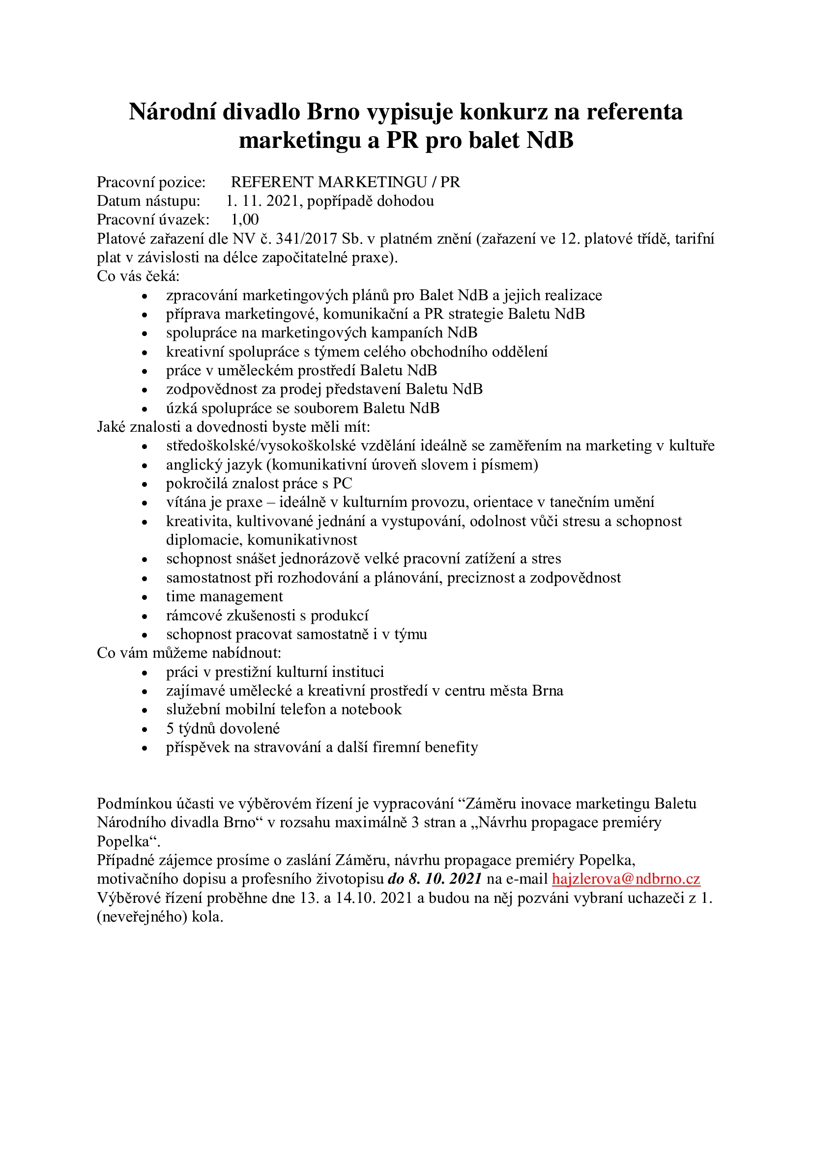 Inzerce Národní divadlo Brno vypisuje konkurz na referenta marketingu a PR pro balet NdB Publikováno 23/09/2021 sdílejte: 0 minut čtení sdílejte: TémataSeznam inzerátů Sdílet článek Facebook email zkopíruj odkaz vytisknout sdílejte: Předchozí článek FOK odvysílá Pražské metamorfózy Petra Wajsara online Další článek Cyklus Hybatelé rezonance zahájí 4. října Miroslav Sekera 0 0 hlasy Ohodnoťte článek Odebírat Přihlášení Upozornit na nové a další komentáře nové odpovědi na můj komentář Label {} [+] Jméno* E-mail* Webová stránka Label {} [+] Jméno* E-mail* Webová stránka 0 Komentáře Nejstarší Nejnovější Most Voted Inline Feedbacks Zobrazit všechny komentáře Načíst další