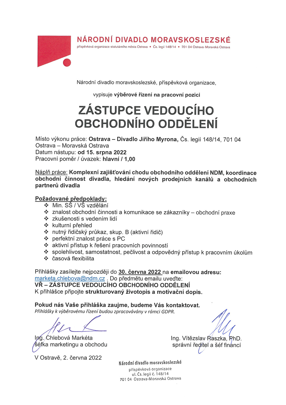 Čtení Národní divadlo moravskoslezské hledá zástupce vedoucího obchodního oddělení