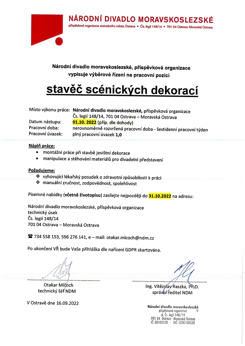 Inzerce Národní divadlo moravskoslezské vyhlašuje konkurz na technika Publikováno 30/09/2022 sdílejte: 0 minut čtení sdílejte: TémataSeznam inzerátů Sdílet článek Facebook email zkopíruj odkaz vytisknout sdílejte: Předchozí článek Operní panorama Heleny Havlíkové (382) – Záludnosti operety i koncertního uvádění Rusalky Další článek Skončil třetí ročník Culture Get-Together 2022 0 0 hlasy Ohodnoťte článek Odebírat Přihlášení Upozornit na nové a další komentáře nové odpovědi na můj komentář Label {} [+] Jméno* E-mail* Webová stránka Label {} [+] Jméno* E-mail* Webová stránka 0 Komentáře Nejstarší Nejnovější Most Voted Inline Feedbacks Zobrazit všechny komentáře Načíst další