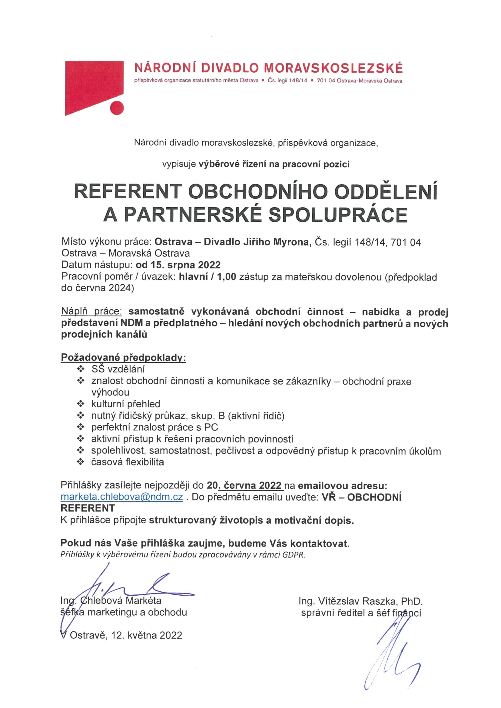 Čtení Národní divadlo moravskoslezské vypisuje výběrové řízení na pozici referenta obchodního oddělení a partnerské spolupráce