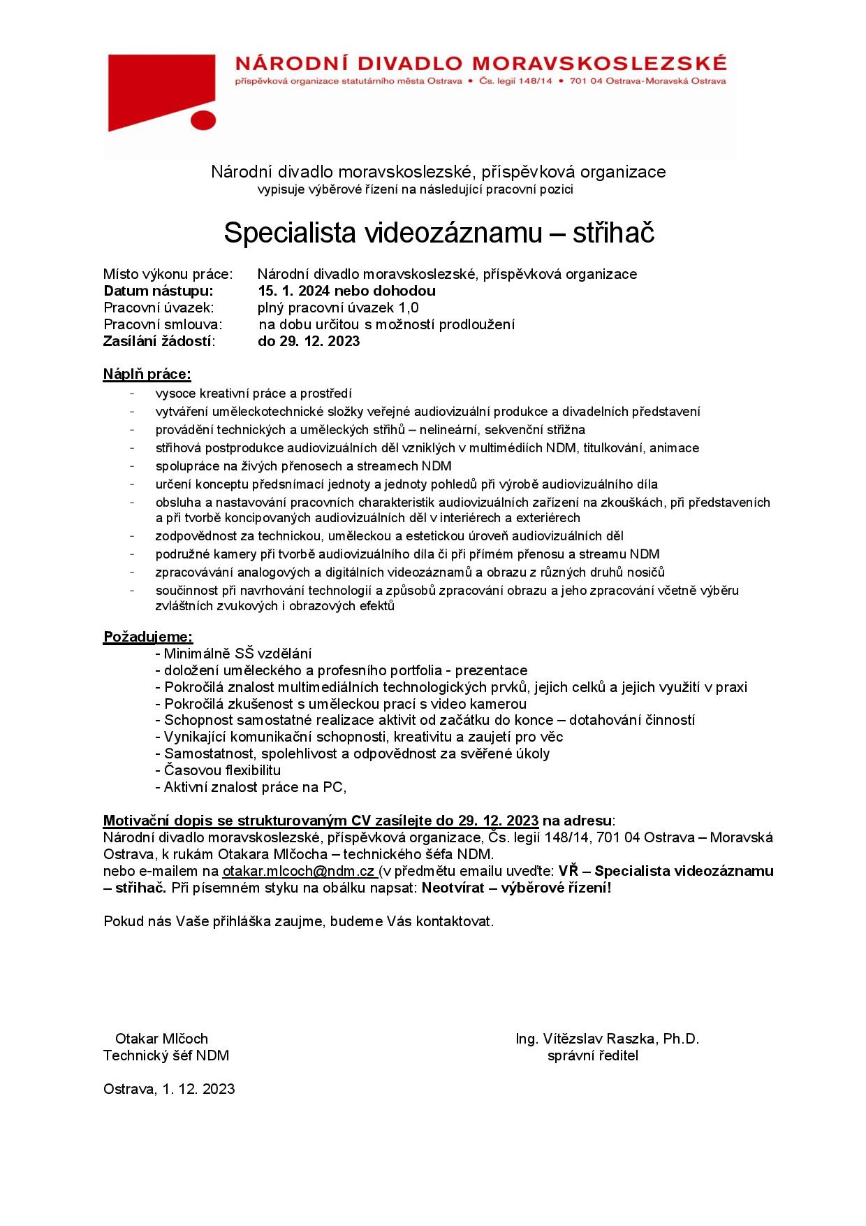 Inzerce Národní divadlo moravskoslezské vypisuje výběrové řízení na pozici specialista videozáznamu – střihač Publikováno 09/12/2023 sdílejte: 0 minut čtení sdílejte: TémataSeznam inzerátů Sdílet článek Facebook email zkopíruj odkaz vytisknout sdílejte: Předchozí článek Náznaky španělského temperamentu v podání Filharmonie Brno Další článek Rossiniho Popelka ožila v akčním koncertním provedení 0 0 hlasy Ohodnoťte článek Odebírat Přihlášení Upozornit na nové a další komentáře nové odpovědi na můj komentář Label {} [+] Jméno* E-mail* Webová stránka Label {} [+] Jméno* E-mail* Webová stránka 0 Komentáře Nejstarší Nejnovější Most Voted Inline Feedbacks Zobrazit všechny komentáře Načíst další