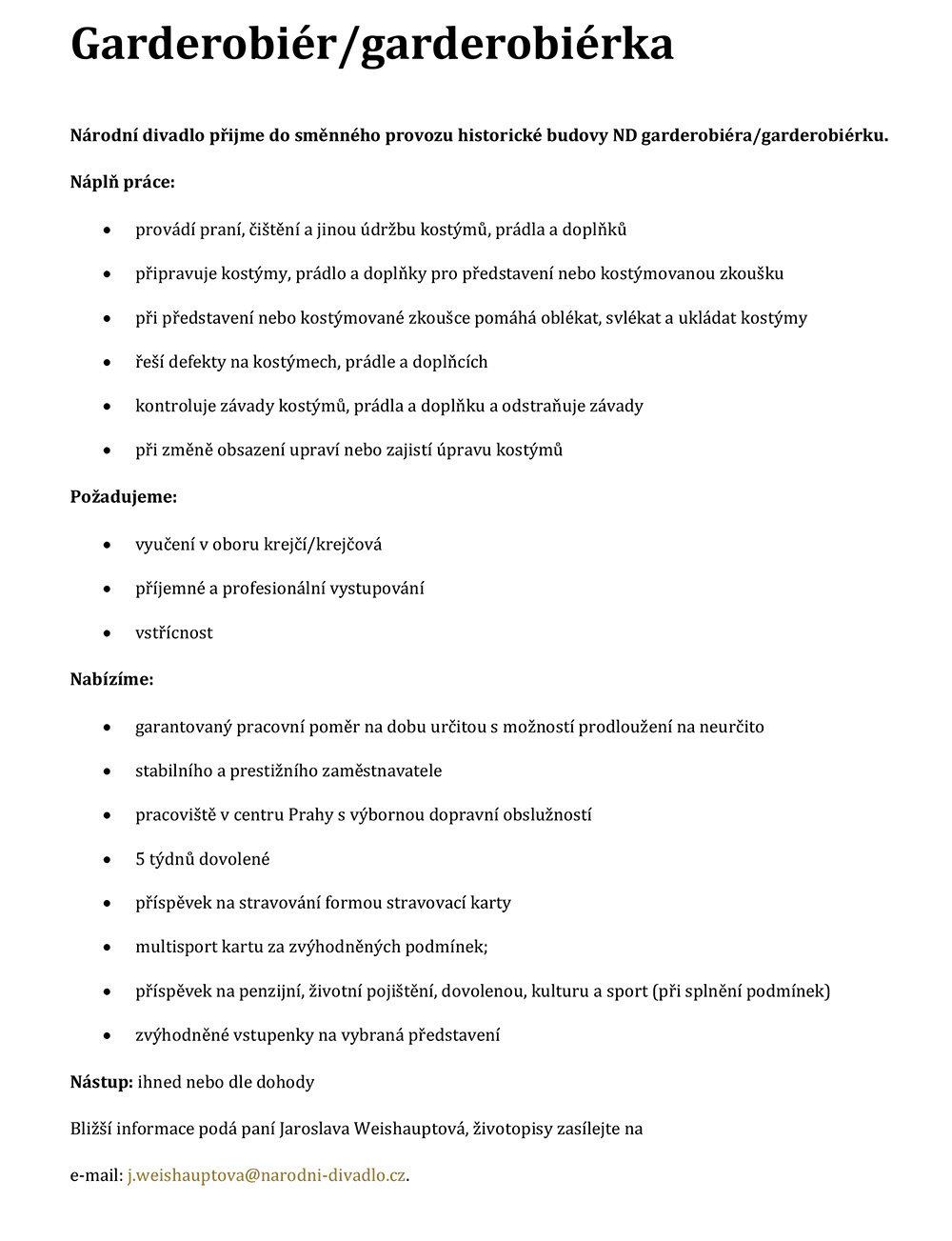 Inzerce Národní divadlo přijme do směnného provozu historické budovy ND garderobiéra Publikováno 02/04/2022 sdílejte: 0 minut čtení sdílejte: TémataSeznam inzerátů Sdílet článek Facebook email zkopíruj odkaz vytisknout sdílejte: Předchozí článek Franz Welser-Möst: Bruckner pro mě znamená domov Další článek Franz Welser-Möst byl v Rudolfinu odměněn dlouhým aplausem 0 0 hlasy Ohodnoťte článek Odebírat Přihlášení Upozornit na nové a další komentáře nové odpovědi na můj komentář Label {} [+] Jméno* E-mail* Webová stránka Label {} [+] Jméno* E-mail* Webová stránka 0 Komentáře Nejstarší Nejnovější Most Voted Inline Feedbacks Zobrazit všechny komentáře Načíst další