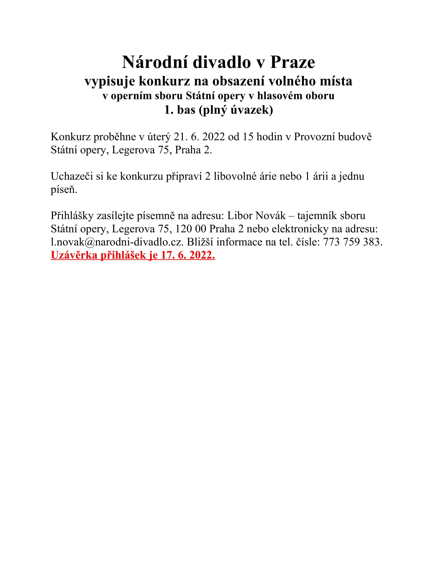 Inzerce Národní divadlo vypisuje konkurz na obsazení místa 1. basu v operním sboru Státní opery Publikováno 12/05/2022 sdílejte: 0 minut čtení sdílejte: TémataSeznam inzerátů Sdílet článek Facebook email zkopíruj odkaz vytisknout sdílejte: Předchozí článek Uri Caine řekl Beethovenově Deváté Nein! Další článek Tenorista Iván Ayón-Rivas vystoupil poprvé v Praze 0 0 hlasy Ohodnoťte článek Odebírat Přihlášení Upozornit na nové a další komentáře nové odpovědi na můj komentář Label {} [+] Jméno* E-mail* Webová stránka Label {} [+] Jméno* E-mail* Webová stránka 0 Komentáře Nejstarší Nejnovější Most Voted Inline Feedbacks Zobrazit všechny komentáře Načíst další