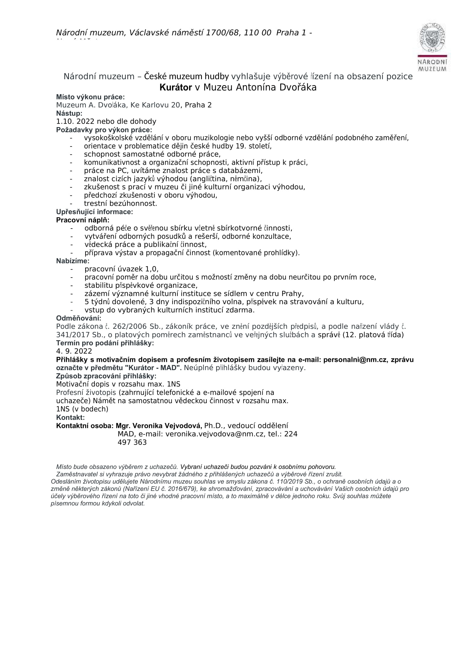 Národní muzeum – České muzeum hudby vypisuje výběrové řízení na pozici kurátora v Muzeu Antonína Dvořáka