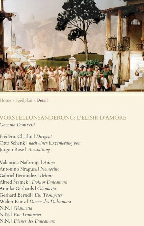 Nejuznávanější současný představitel Eléazara, za pár týdnů šestašedesátiletý americký tenorista Neil Shicoff totiž onemocněl (má zánět hrtanu) a náhradu za něj se divadlu najít nepodařilo.Zachraňovat pondělní večer ve Vídeňské státní opeře tak bude Schenkův Nápoj lásky, který se managementu podařilo jako změnu na program nasadit.