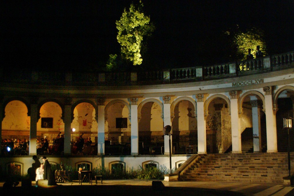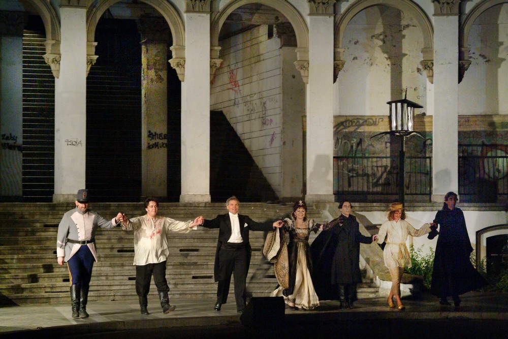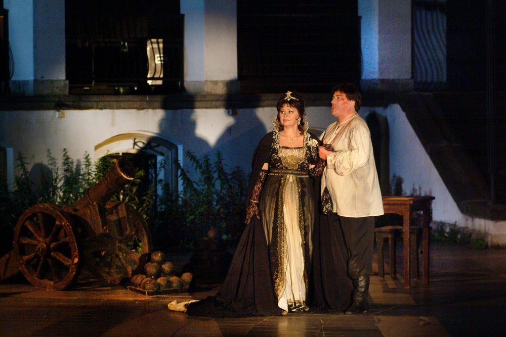 Nedlouhá cesta Divadelní ulicí vede okolo krásné, novobarokní budovy Loutkového divadla a přilehlého parku až na ,,Pahorek partyzánů“. Je to v podstatě park s belvederem, který je tvořený pseudorenesančními polokruhovými arkádami, umělým jezírkem a schodišti. To vše bylo postaveno na původních městských hradbách. Samozřejmě Andělský hrad, kde se poslední dějství odehrává, to není. Obzvláště večer, při vhodném nasvícení je to velmi romantické místo, které si přímo říká o pořádání divadelních seancí. Orchestr byl umístěn pod levou částí arkád. Tento velký venkovní prostor musel být samozřejmě uměle ozvučen, jinak by třeba soprán Pastýře v podání Marty Brzezińské byl asi slyšet poněkud slabě. Závěrečná poprava Maria Cavaradossiho, stojícího na širokém schodišti, vojenskou četou proběhla velmi autenticky a na jeho bílé košili se objevily krvavé skvrny po kulkách. Pád Tosky z vysoko položené balustrády nad arkádami belvederu do temného prostoru nebyl nijak teatrální. Všichni účinkující byli po právu odměněni dlouhotrvajícím aplausem spokojených diváků, kteří se jen neradi rozcházeli do vlahé červnové noci.+++