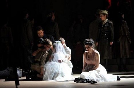 Pri tom, ako Cesar sprevádza spievanie o „práve a moci povzniesť nevestu na výslnie slávy“ prudkým odsotením Beatrice, začínam pochybovať o niečom zdravom rozume. Krásny to milovník, len čo je pravda! Nemá zmysel opisovať dopodrobna všetky momenty, v ktorých zbrane a prejavy moci prevalcovali akýkoľvek cit a ušľachtilosť. Zvolený inscenačný kľúč proste nevyšiel. Výjav z onoho sveta, ktorý počas smútočného pochodu pozoruje mŕtvy Manuel, obchádzajúc točňu, je vzhľadom na doteraz použité výrazové prostriedky nezmyselnou a hluchou vsuvkou, ktorá zabila jednu z najkrajších častí partitúry. Ak už ale režisérka neverí hudbe, prečo neverí ani svojmu vlastnému štýlu? Dopad neľútostného rozhodnutia kniežaťa na celý dej je predsa najmarkantnejší, keď Isabella líči jeho sen. Vtedy však fotografiu „generalissima“ nevidíme, hoci je na očiach takmer celé prvé dejstvo. Ak je Manuel vojenským dôstojníkom, prečo jeho mŕtvolu namiesto čestnej stráže sprevádzajú ženy s ľaliami a sviečkami, navyše odeté tak, že niektoré z nich pripomínajú oné dámy z E55? Záverečný výjav, v ktorom k Isabelle, smútiacej nad mŕtvolami oboch synov, pribiehajú tri detičky ako personifikácia jej sna o kompletnej rodine, je už len gýčovým balastom, ktorý nedokáže prehlušiť prinajmenšom rozporuplný (u mňa osobne odpudivý) dojem z doteraz videného.
