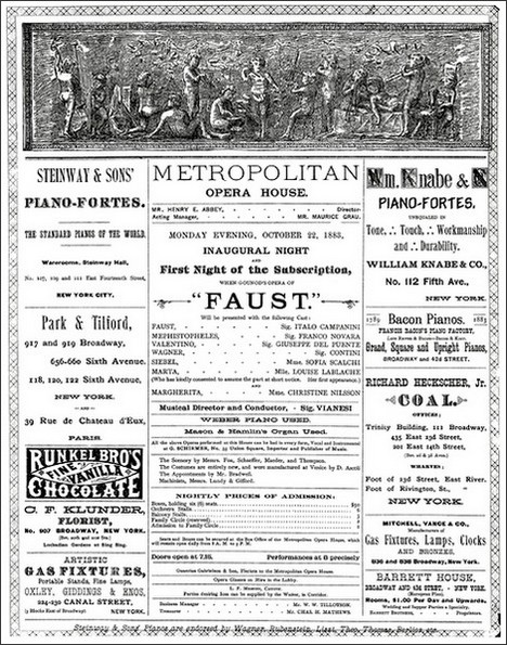 Tito mužové dosáhli spojenými silami toho, že 22. října 1883 (necelý měsíc před otevřením pražského Národního – sic!!), byla představením Gounodova Fausta a Markétky slavnostně otevřena divadelní budova na rohu Broadwaye a třicáté deváté ulice s obrovským hledištěm pro tři tisíce šest set dvacet pět diváků pro provozování opery.A prudce se rozvíjející metropole na ostrově mezi Hudsonem a East River měla od počátku dostat jenom to nejlepší dosažitelné, proto bylo rozhodnuto, že k jejímu provozování budou angažovány nejlepší pěvecké síly z Evropy. Z toho důvodu, aby se zpěváci nemuseli učit své texty, bylo rozhodnuto, že opery budou zpívány v italštině.