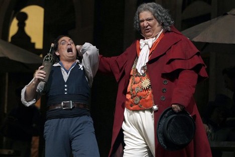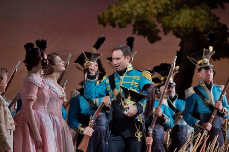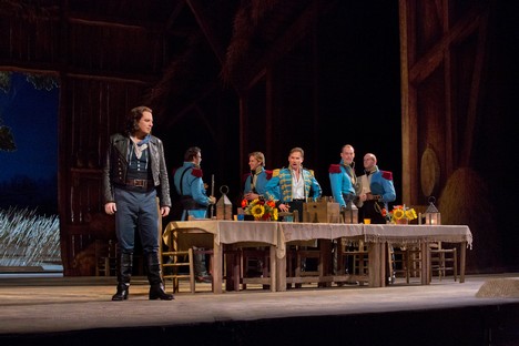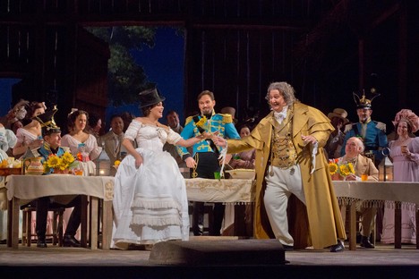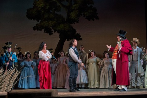 Je vidět, že vedení Met si jmenovaných pěvců v Donizettim cení, neb jsme se s nimi opět setkali v L’elisir d’amore. V inscenaci dirigenta Maurizia Beniniho a v režii Barletta Shera a jeho spoluprací s kostýmní výtvarnicí Catherine Zuber. Tato dáma vytvořila opravdu barevně velmi výrazné kostýmy, které u stejných sborových aktérů až trochu nadbytečně mění, snad aby bylo dosaženo až jisté přehnané mnohobarevnosti, když se režijní nápaditosti dostává jen v míře potřebné divadelní rutiny. Situačních gagů a nápadů bych byl čekal o trochu víc. Nejen banality, kde jeden sborista na druhého coby „vtip“ vylije vcelku bez zjevné příčiny druhému na hlavu vědro vody – chachacha… Opravdu gagy k popukání na rádoby realistické scéně starých zlatých časů. Sbory předvádějící vcelku snadno předpokládané jednoduché pohyby (v tomto směru byl kdysi náš Hanuš Thein v buffách o dost nápaditější!). Byť jistě u opery virtuózního typu, nechť jsem spravedlivý, jsou v popředí očekávání pěvecké výkony, ale i výkony komediální u protagonistů, které z Met předpokládám na relativně nejlepší možné úrovni. Podtrhuji slůvečko relativní! Vynikajících pěvců je vždy málo a tak je zná Vídeň či Mnichov, Drážďany i Londýn.V popředí premiéry L’elisir d’amore v pěveckém projevu exceloval krásný, lehce tvořený lyrický tenor sympatického pěvce Matthewa Polenzaniho, jemuž Nemorino přece jen vytvořil širší pěveckou příležitost než v Ernestovi, roli podobného oboru (byl i v dubnu skvělým Verdiho Alfredem!). Jedna z nejoblíbenějších árií lyrického oboru Una furtiva lagrima byla přednesena s noblesou, lehkým, měkkým tónovým nasazením, příkladně tvořenými tóny přechodové oblasti F – As, s hebce odvíjenou kantilénou, imponujícími modulacemi opojného témbru. Takhle si představuji ideální interpretaci této árie, kterou kdysi s podobnými nuancemi nahrál legendární pěvec pian a mezza voce – Tito Schipa. Však také spravedlivý, dlouhý potlesk auditoria Met po árii byl dokladem mnou řečeného. Také scéna Quanto è bella, quanto è cara upoutala obdiv publika kantilénou i lehkými výškami. Jevištně vytvořil roztomilého Nemorina, od naivního tápání až po šťastný happy end velmi přesvědčivě.
