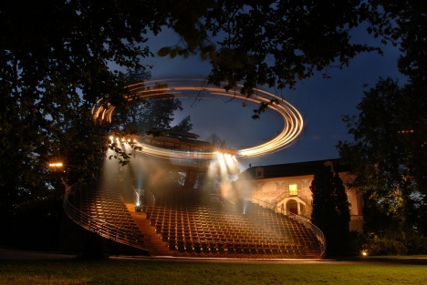 Kompromisní řešení s demontovatelnou točnou vychází z podobných příkladů ve světě. Obdobné řešení je uplatněno například při divadelních představeních ve Francii na Neptunově bazénu zámku ve Versailles nebo na zámku Chambord v údolí řeky Loiry.