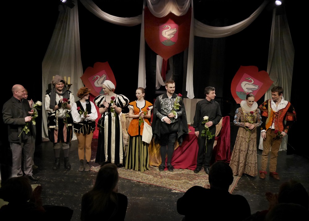Režie a scény se ujal pedagog Konzervatoře Gustav Skála. Velmi rozumně se nepokusil udělat z vtipného komického dílka něco experimentálního a nadčasového. Striktně se držel Stroupežnického textu, ve kterém se samozřejmě objevují některá roztomile archaická slova českého jazyka konce devatenáctého století a výrazy charakteristické pro rok 1585, kdy se děj komedie na Zvíkovském hradě odehrává. Na otevřeném jevišti školního divadla nás zaujme jednoduchá, ale barevná dekorace tvořená pomocí závěsů a několika erbů s bílou labutí, znakem švamberského rodu. Vše je doplněno dobovým nábytkem. Rovněž kostýmy věrně charakterizují období pozdní renesance.