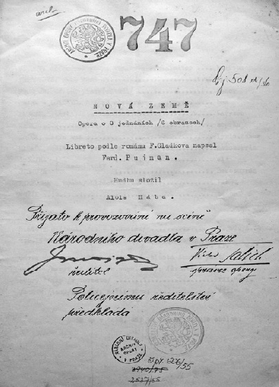 Operu Nová země zadal Hába Národnímu divadlu dopisem z 22. května 1936, 2. června obdržel zprávu, že opera byla „předběžně pojata do programu na příští sezonu 1936/37“. Smlouva o provozování byla uzavřena 11. srpna na základě kladného uměleckého posudku správce opery Václava Talicha.