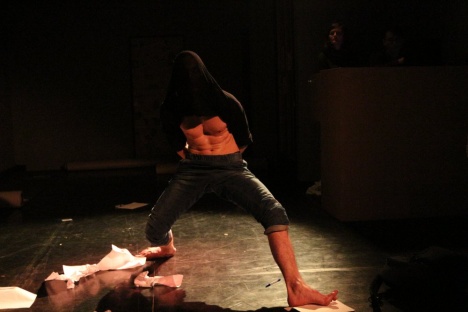 Název díla je ozřejměn v pohybové sekvenci, kdy zapracuje především light design a my z mladíka neuvidíme skoro nic jiného než odhalené břicho, které dokáže rozpohybovat tak, jako kdyby šlo o ústa. A také se vlastním hlasem doprovází, snad jako by chtěl naznačit druhý hlas uvnitř své osobnosti, který na sebe bere groteskní podobu (a je to konec konců on, tento střed těla, po němž je inscenace pojmenována, ačkoli sázím, že na začátku byl náhodný pohybový nápad, a ne úmysl). Hlas je ostatně v současném alternativním divadle často náhradou jakéhokoli hudebního doprovodu. Také tato inscenace si v řadě míst vystačí s tichem či hlasem, a těch několik kousků soudobé či konkrétní hudby, jež ticho přeruší, zřejmě performerovi ani nestálo za zmínku v programu. Nachází rytmus ve vlastním těle, určuje si jím vnitřní napětí a nutí tím diváky o to víc, aby se na něj napojili.