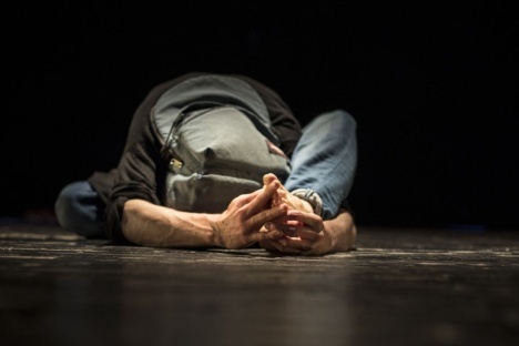 Je zručný v zacházení s rekvizitou. Banální nasazení batohu na hlavu dokáže podat jako zrod málem mimozemské bytosti. A v následující pohybové etudě se zase zcela vtěluje do reflexů hravého psa. Snaha o první interakci s publikem nevychází, divačka nechce psíkovi hodit batoh k aportování. A tak se mění zase v jiného tvora, opět s batohem místo trupu, a protože své tělo ovládá díky praktikování jógy, dovede se vměstnat do krkolomné pozice, v níž připomíná čtyřnohého pavouka. Pak jako kdyby etapa bláznění pominula a náš mladý muž se vrací k existenci člověka.