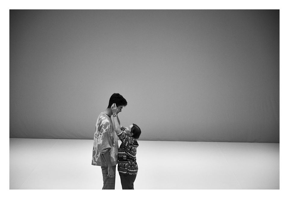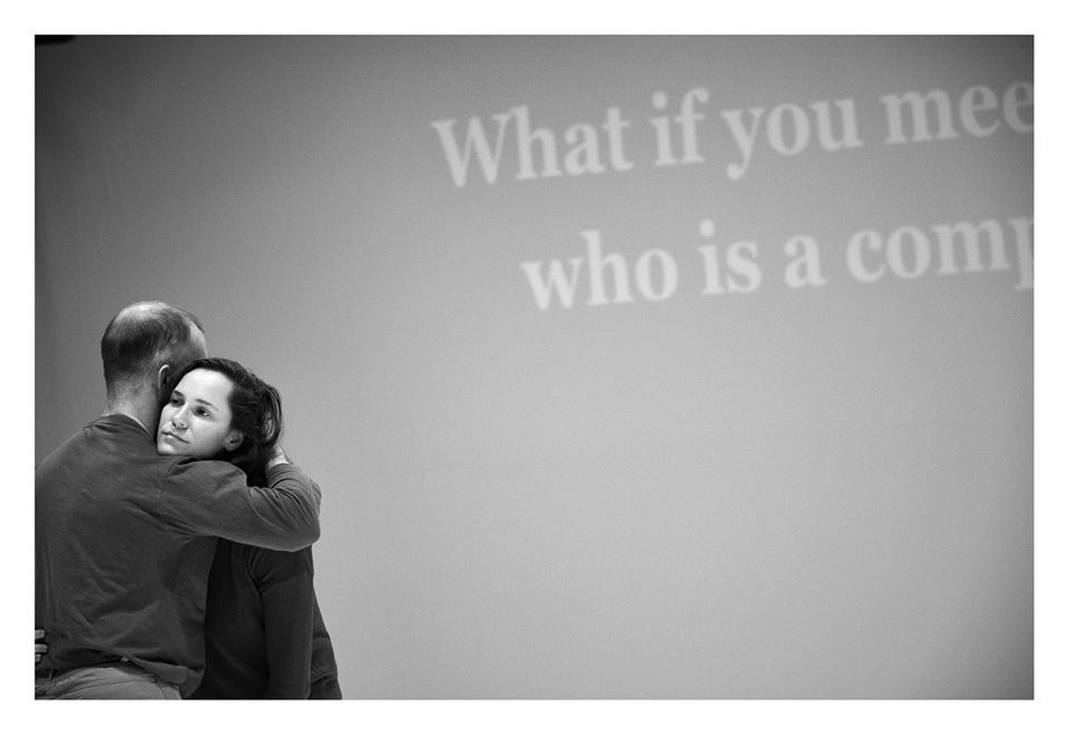 Duety… Duety jsou inscenací, v níž jistě velkou část dění na scéně ovlivňuje náhoda, rozhodně se tedy nejedná o inscenování kompletně připraveného tvaru, ale spíše o řízený proces s vytyčenými mantinely. Jak se můžeme dozvědět, projekt vznikl na podkladě workshopů, v nichž se performeři a tanečníci setkali s protějšky, s nimž se předtím neznali. Což by samo o sobě nebylo tak zvláštní, ale samotné setkání je základním námětem celé performance a podstatná je i metoda, jakou byla vytvořena. Zdánlivě jde o motiv prostý. Setkání a (někdy první) kontakt dvou lidí, který vůbec nemusí být fyzický, může být jen dlouhým pohledem z očí do očí, provázeným nervózními úsměvy a nejistotou. Pouze dvojice. A k tomu ještě přihlížející dav.