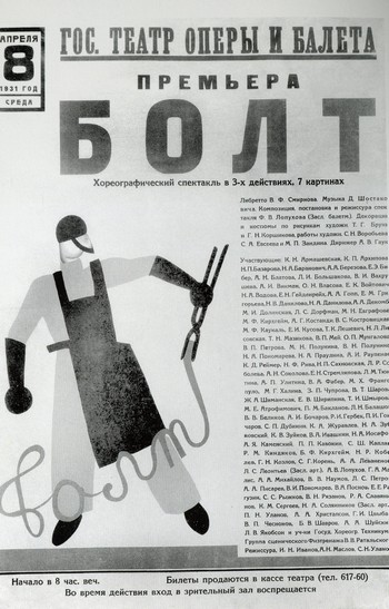 V témže roce Fjodor Lopuchov s Dmitrijem Šostakovičem a libretistou Viktorem Smirnovem uvedli v Sankt Peterburku balet Bolt – Šroub, první sovětský balet z továrního prostředí. Satira „industriálního baletu“ pojednávala o továrně, kde skupina opilých sabotérů vloží velký šroub do soukolí stroje, aby zastavila výrobu a pomstila se za to, že jeden z opilců byl vedoucím pracovní směny napomenut. Příběh byl postaven na skutečné události v továrně Rudý Herkules a jak dokládají písemné dokumenty z archívů, autoři baletu při jeho přípravě pečlivě studovali tovární prostředí a jeho problémy. Nicméně balet byl zakázán již po veřejné kostýmní zkoušce. K premiéře nedošlo.Scénografka Tatiana Bruni (1902-2001) vzpomíná: „Tehdy byly kostýmní zkoušky přístupné veřejnosti. Divadlo bylo přeplněno. Jakmile se zvedla opona, strhl se potlesk. Když začaly pracovat stroje, potlesk se změnil v ovace, které neskončily do konce představení…Přísahám při všem svatém, že tomu tak bylo. Nesouhlasné bučení opozice bylo přehlušeno potleskem. Přesto bylo představení zrušeno, balet byl uveden jen jednou. Za propad jsme byli obviněni my. Tisk nás káral, vzpomínám na titul článku: „Šroub a žvaniví formalisté“. Žádné skicy mi nezůstaly. Některé v divadle roztrhali zvláště rozčílení přívrženci socialistického realismu.“