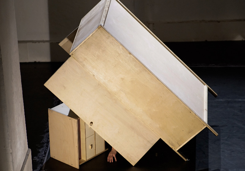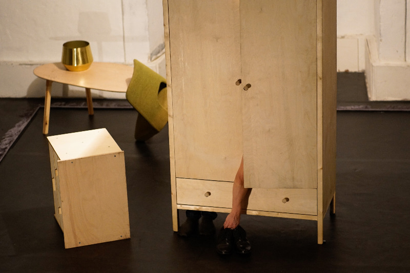 V prostoru – pokoji ohraničeném příjemně minimalistickým náznakem koberce s třásněmi dominovala dřevěná dvoudveřová skříň. Jejím partnerem ve hře a komunikaci se později stala menší komoda se zásuvkami, jež v symbióze s lidskou postavou připomínala roztomilou, obrovskou hlavu s člověčími rysy, jako jsou oči a ústa. Kolorit místnosti doplňoval stolek, stoličky a lampy, stolní u země a mezi podlahou a stropem závěsná s rozložitým stínidlem a dlouhou ovládací šňůrou zakončenou roztřepenou ozdobou. U vybavení ke stolování absentovala minimálně jedna podpora, tj. každému prvku chyběla noha. Pokoj na první pohled působil tiše a zapomenutě, a přesto hned na několika úrovních naznačoval nerovnováhu či nesoulad. Neexistující verbální narativ zajišťoval obsahovou a fyzickou nepředvídatelnost. Geometrie, rozměry a tvary předmětů však dávaly tušit, kudy povedou pohybové – manipulační trajektorie a na mysl se plížily myšlenky povzbuzované zvídavostí, co by se stalo, kdyby… Pohyb performera byl členěn na účelové úchopy a přesuny a na výrazový pohyb, jenž původní praktičnost a hospodárnost posouval do roviny metaforické, asociativní a následně z hlediska interpretace ryze divácky individuální.