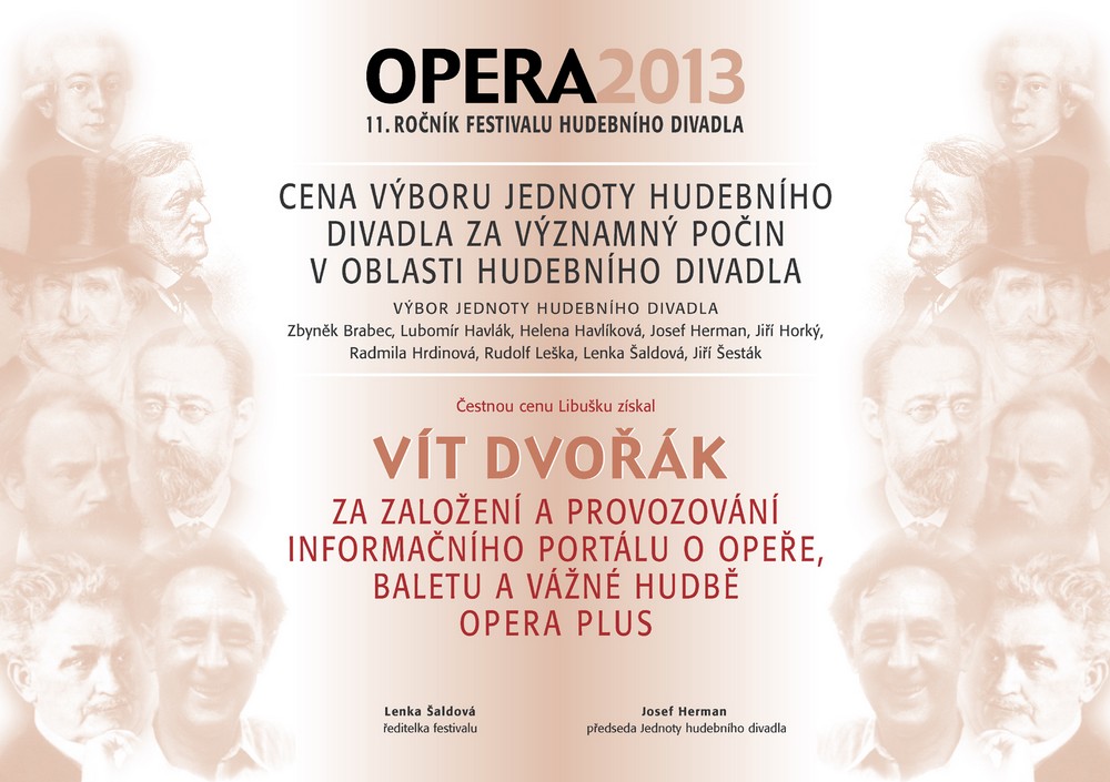 Festival hudebního divadla Opera 2013 přinesl při včerejším závěrečném večeru v Českém muzeu hudby, kdy byla uvedena brněnská La Dafne Tomáše Hanzlíka a Víta Zouhara,  i jednu radostnou událost, týkající se našeho portálu. Jednota hudebního divadla jako pořadatel festivalu udělila jednu z letošních festivalových cen – Libušku – šéfredaktorovi portálu Opera Plus, a to  „za významný počin v oblasti hudebního divadla“. Od ředitelky festivalu Lenky Šaldové a předsedy Jednoty hudebního divadla Josefa Hermana převzal ocenění za všechny spolupracovníky Opery Plus Vít Dvořák. Děkujeme!