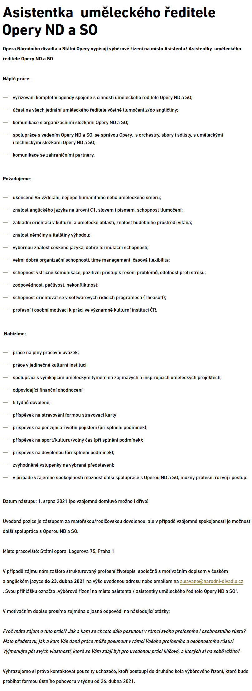 Inzerce Opera Národního divadla a Státní opera hledají asistenta/asistentku uměleckého ředitele opery Publikováno 08/04/2021 sdílejte: 0 minut čtení sdílejte: TémataSeznam inzerátů Sdílet článek Facebook email zkopíruj odkaz vytisknout sdílejte: Předchozí článek Charles Baudelaire a hudba Další článek Andrea Bocelli zpíval v poušti 5 1 hlasovat Ohodnoťte článek Odebírat Přihlášení Upozornit na nové a další komentáře nové odpovědi na můj komentář Label {} [+] Jméno* E-mail* Webová stránka Label {} [+] Jméno* E-mail* Webová stránka 0 Komentáře Nejstarší Nejnovější Most Voted Inline Feedbacks Zobrazit všechny komentáře Načíst další