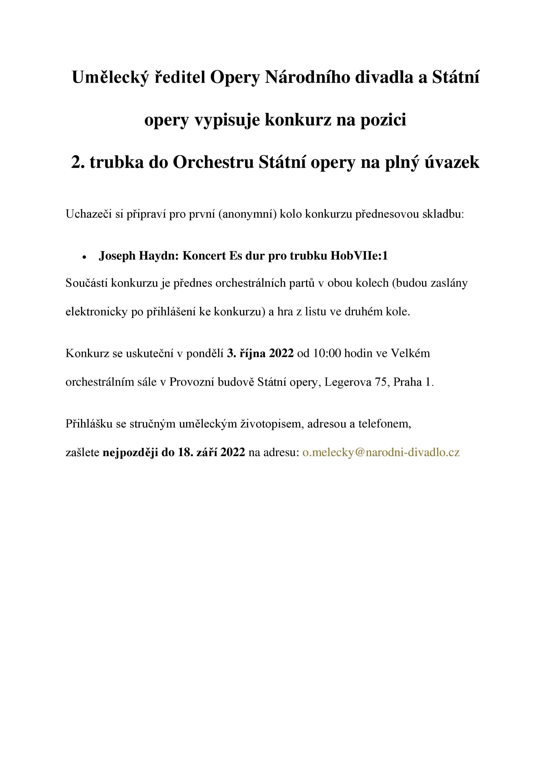 Inzerce Opera Národního divadla a Státní opera vypisuje konkurz na pozici 2. trubky do Orchestru Státní opery Publikováno 11/07/2022 sdílejte: 0 minut čtení sdílejte: TémataSeznam inzerátů Sdílet článek Facebook email zkopíruj odkaz vytisknout sdílejte: Předchozí článek Týden s hudbou. Letní koncerty a představení živě i online Další článek Klavírista Boris Giltburg znovu vystoupí na festivalu Za poklady Broumovska 0 0 hlasy Ohodnoťte článek Odebírat Přihlášení Upozornit na nové a další komentáře nové odpovědi na můj komentář Label {} [+] Jméno* E-mail* Webová stránka Label {} [+] Jméno* E-mail* Webová stránka 0 Komentáře Nejstarší Nejnovější Most Voted Inline Feedbacks Zobrazit všechny komentáře Načíst další
