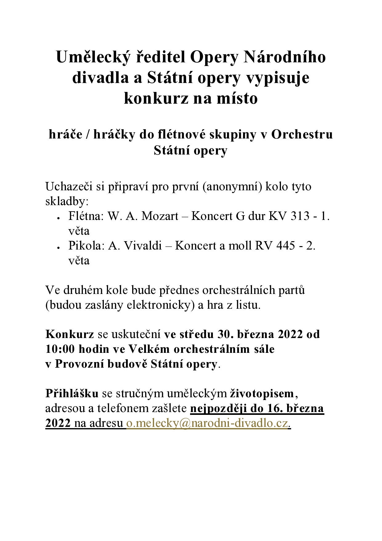 Inzerce Opera Národního divadla vypisuje konkurz na místo hráče flétnové skupiny v Orchestru Státní opery Publikováno 06/01/2022 sdílejte: 0 minut čtení sdílejte: TémataSeznam inzerátů Sdílet článek Facebook email zkopíruj odkaz vytisknout sdílejte: Předchozí článek Soubor opery a operety Moravského divadla povede od nové sezony Veronika Loulová Další článek Ukradené housle se po 35 letech vrátily k majiteli díky zvláštní řezbě 0 0 hlasy Ohodnoťte článek Odebírat Přihlášení Upozornit na nové a další komentáře nové odpovědi na můj komentář Label {} [+] Jméno* E-mail* Webová stránka Label {} [+] Jméno* E-mail* Webová stránka 0 Komentáře Nejstarší Nejnovější Most Voted Inline Feedbacks Zobrazit všechny komentáře Načíst další
