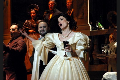 Zub času sa však pod ňu podpísal tak zreteľne, že jej pôvodné „devízy“, motív inšpirácie literárnou predlohou, vo výtvarnej symbolike zobrazené uhasínanie života vyprázdňovaním javiska a napokon i rámcovanie príbehu umiestnením Violetty do prízemnej lóže (dnes nefunkčné, keďže sa opera hrá v novej budove), strácajú ostne dramatickej naliehavosti. Pôvodným dirigentom bol hosťujúci Jan Zbavitel, zdatný praktik a spoľahlivý partner spevákov. Žiaľ, cabaletta Alfreda, ostala aj tento raz vyškrtnutá. Tri Violetty boli rozdielne – Jana Valášková emotívna, lyricko-romantická, Iveta Matyášová – tmavšia, dramatickejšia, reprezentujúca taliansku tradíciu obsadzovania role a napokon dievčensky mladučká Ľubica Vargicová – s perlivou koloratúrou v 1.dejstve, označovaná za „Violettu budúcnosti“. Táto moja „veštba“ spred dvoch desaťročí sa naplnila, jediná z pôvodnej trojice spieva Traviatu dodnes. Sviatkom premiéry bolo vystúpenie Petra Dvorského (Alfréd), dokazujúce že umelec ani v rokoch najväčšej slávy nezabúdal na svoju materskú scénu. Alternovali s ním Simon Šomorjai a Igor Jan.