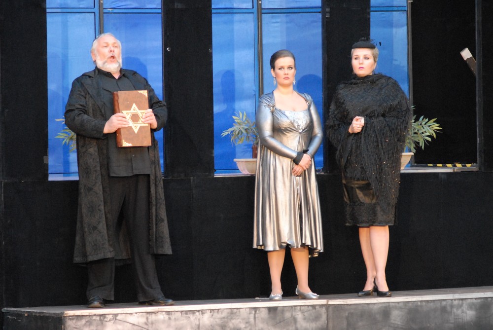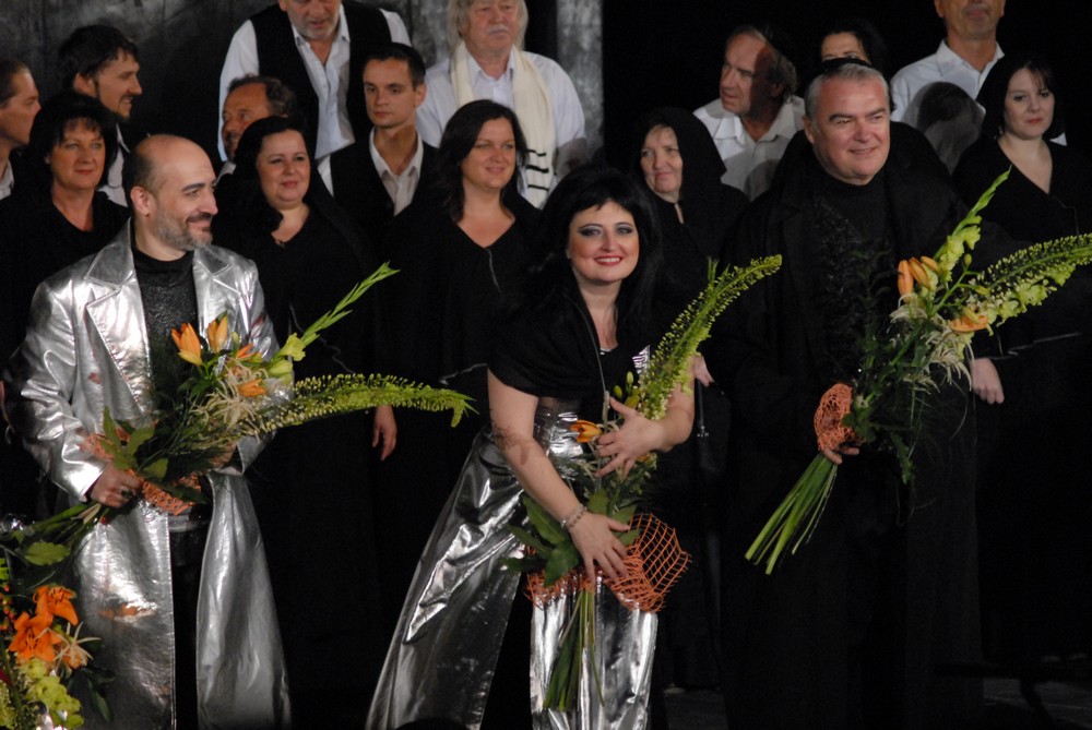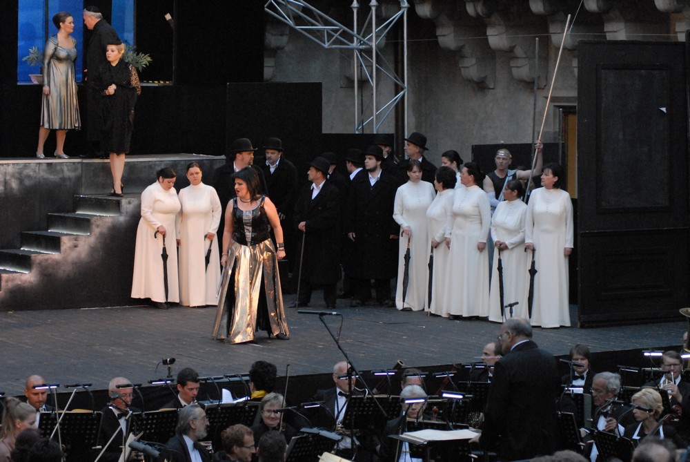 Aspoň záverečné predstavenie Nabucca sa odohralo na zvolenskom zámockom nádvorí pred vypredaným hľadiskom, ktoré nekriticky zbožňuje práve túto Verdiho operu. Špecifická atmosféra nádvoria bola plusom, neľútostný chlad vzduchu zasa mínusom, ktorý pravdepodobne negatívne ovplyvnil niektoré výkony. Marián Vach opäť vyvinul enormnú snahu pre zladenie sa so sólistami, ktorým zavše vo vetre robilo problém dať tónu patričnú nosnosť či intonačnú istotu. Aj v tomto predstavení dominoval výkon Petra Mikuláša, dôsledne interpretujúceho part Zaccariaša plný vysokých i hlbokých tónov, razancie i lyriky. Mezzosopranistka Michaela Šebestová (úspešná banskobystrická Fedora s krásnym materiálom) si zopakovala part Feneny spred dvoch rokov a jej luxusným tenorovým partnerom bol aj snaživo hrajúci Miroslav Dvorský. Trocha viac sa čakalo od dvoch hlavných protagonistov. Vladimír Chmelo i grécka hviezda európskych (najmä talianskych scén) Dimitra Theodossiou mali síce pekné a účinné momenty, ale celkovo ich kreácie zostali za očakávaním. Aj keď sa neoficiálne hovorilo o indispozícii, diváka (i kritika) zaujíma výsledný dojem. A ten sme očakávali lepší. Pri gréckej sopranistke sa potvrdilo to, že „dvakrát nevstúpiš do tej istej rieky“. V roku 2007 totiž predviedla na ZHZ nádherný výkon v Lombarďanoch. Aj teraz preukázala rutinu, viaceré pasáže však odspievala zbytočne (alebo nútene) v pianissime, vo vysokej polohe okrem dvoch-troch pôsobivých výšok vo fortissime spievala skôr šetriac sily. Čiastočne podobné to bolo aj s Chmelom, ktorý akoby niektoré pasáže vypúšťal, hlas strácal na nosnosti a farbe, aby potom zasa na chvíľu zažiaril.+++