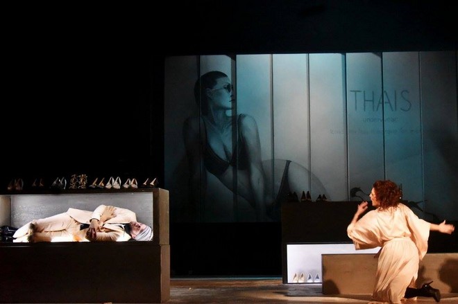 Jevištní podoba liberecké inscenace hovoří aktuálním jazykem. Marnotratná a hýřivá Thaïs se nemůže dopočítat párů své luxusní obuvi v prosvětlených vitrínách, na večírcích se požívá kokain, který si jeho konzumenti shrnují do „lajny“ svými platebními kartami na černých lesklých stolech, Thaïs je zároveň značka módního spodního prádla. Oproti tomu členové mnišské komunity prožívají svůj život uzavřeni každý do své „schránky“ připomínající rakve nastojato.